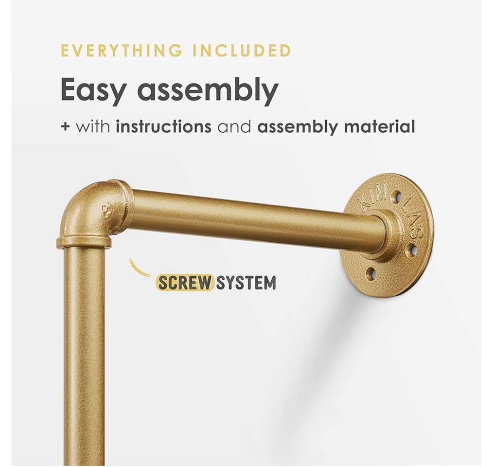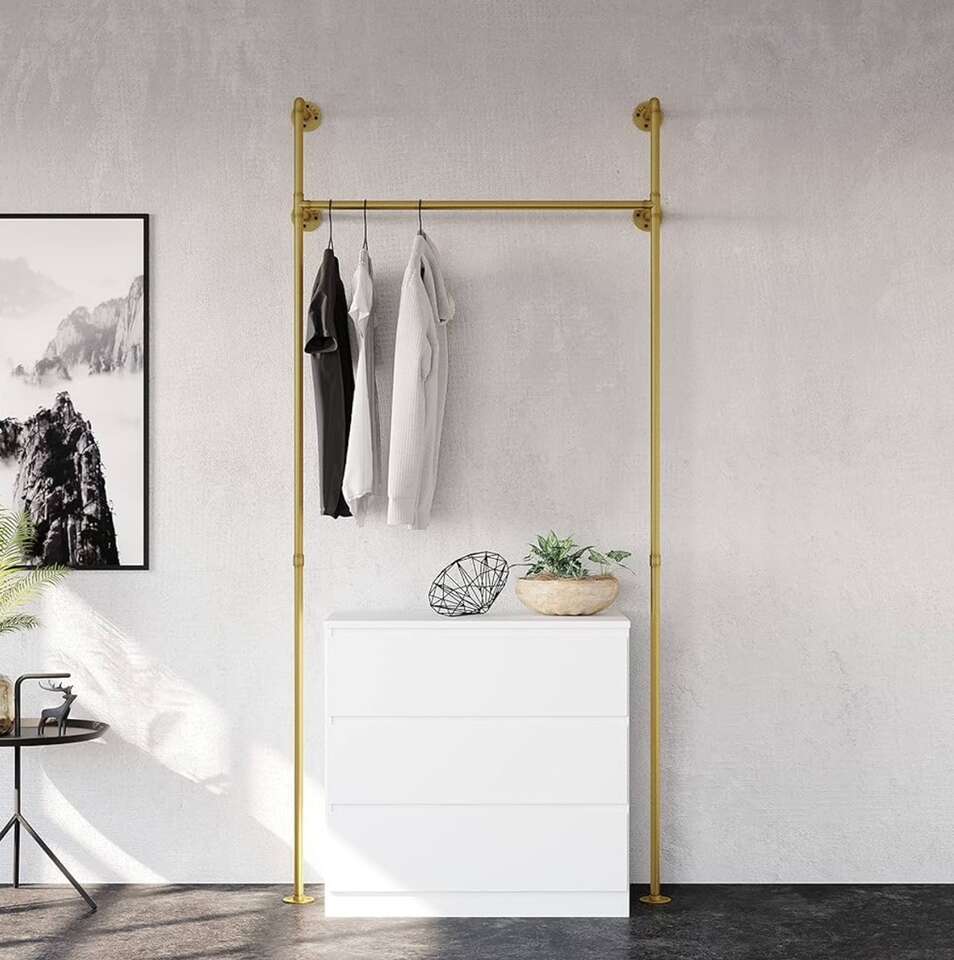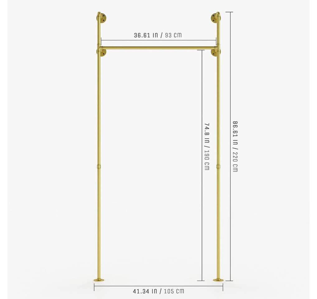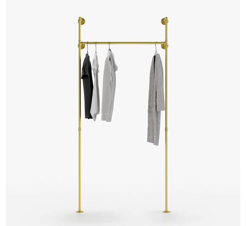 Description- Wall/floor mounted metal industrial pipe clothing rack in gold. See photos for more product information and specifications.