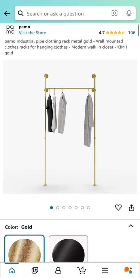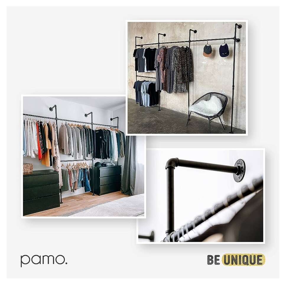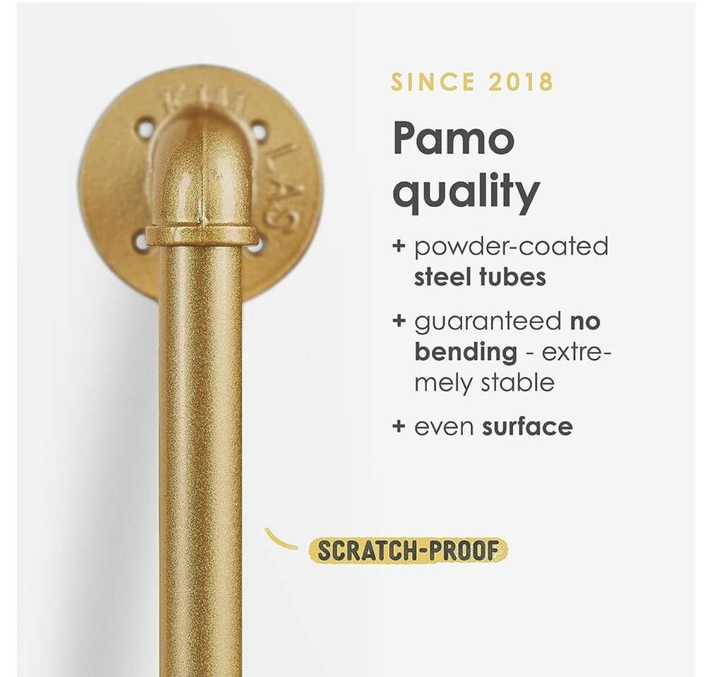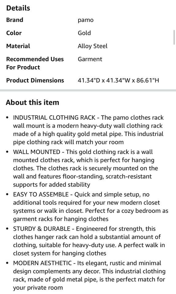 Description- Wall/floor mounted metal industrial pipe clothing rack in gold. See photos for more product information and specifications.