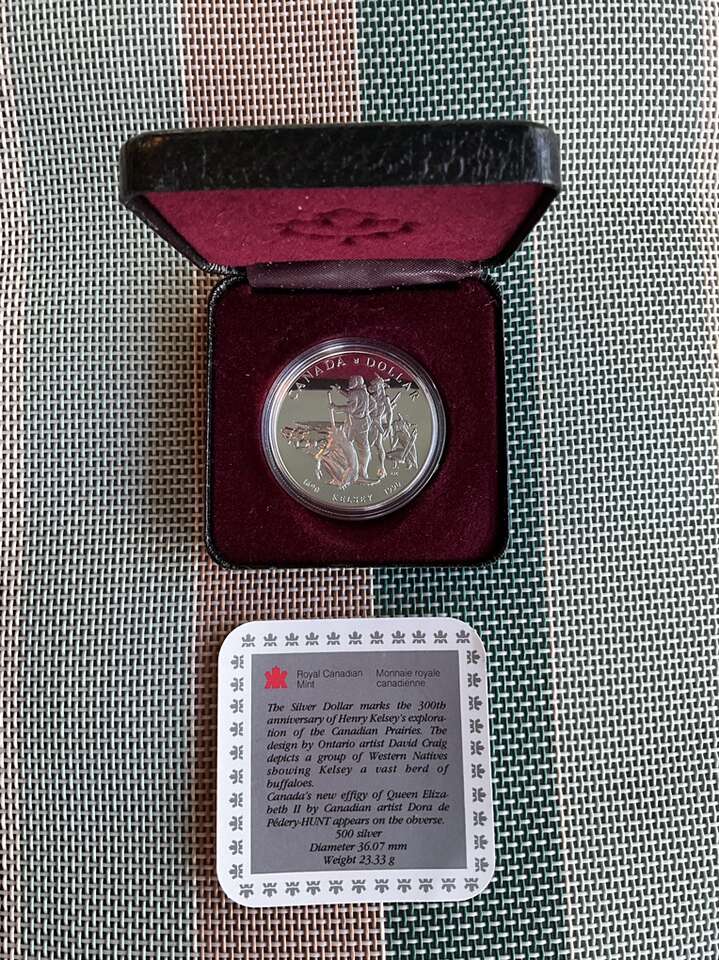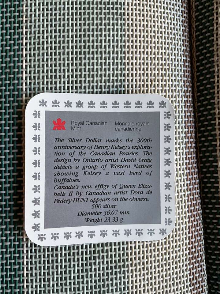 Royal Canadian mint 1990 commemorative silver dollar. This commemorates the 300th anniversary of Henry Kelsey’s exploration of Canadian prairies. Brilliant uncirculated condition. Has been stored safely since minted. Please read the attending card for information. It appears this is “500” silver or 50% silver content.