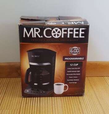 Black coffee maker from Mr. Coffee. The coffee maker has a removable filter basket and the convinient 'Pause 'n Serve' function which lets you pour a cup of coffee while still brewing. It also has a 2-hour auto shut-off and most importantly it is programmable. It works great and makes tasty coffee and hasn't been used much.