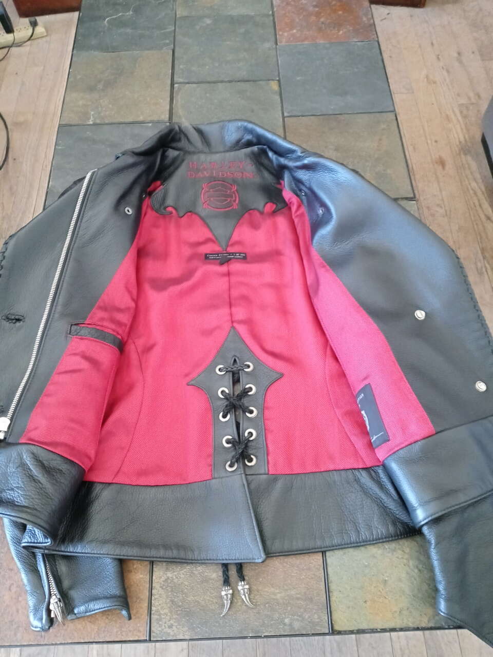 GooglePayI consider this Karen Davidson Leather Biker Jacket a work of art. The masterpiece begins with high-quality Deerskin leather for a vintage look. Highly detailed laser-etched schematics grace the front and back. Stingray skin infuses this women's leather jacket with elegance along with Sterling Silver accents. • Karen Davidson 1 of 150 Limited Edition Made in the USA!• Design Details: Contrast stitching around Stingray inserts!.• Materials: Genuine Deerskin and Stingray. Contrasting, polyester and nylon, red lining. Sterling Silver accents! In New/Exellent condition. Size Medium. ** FREE HELMET INCLUDED!! retail on the jacket was 1600.00