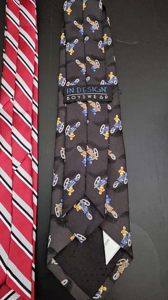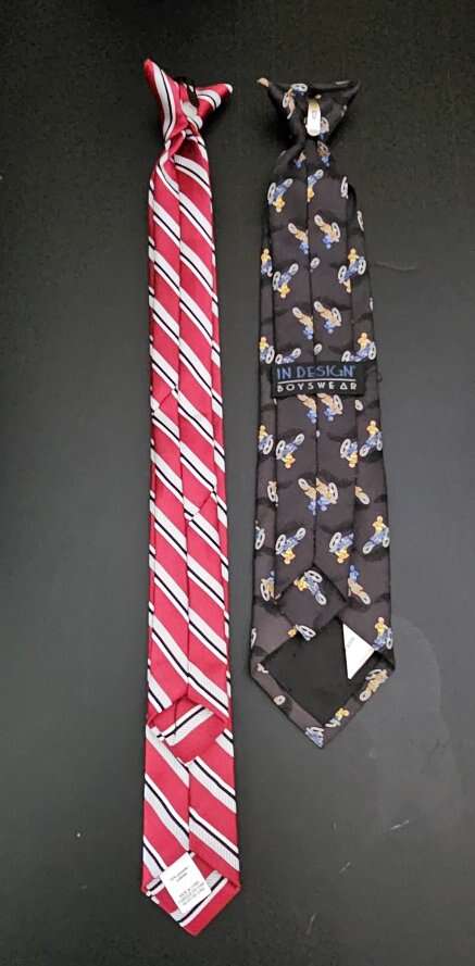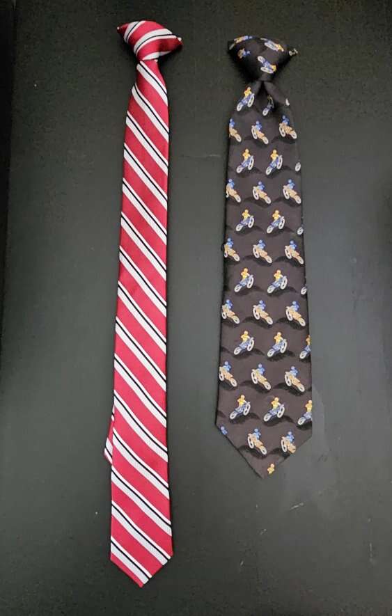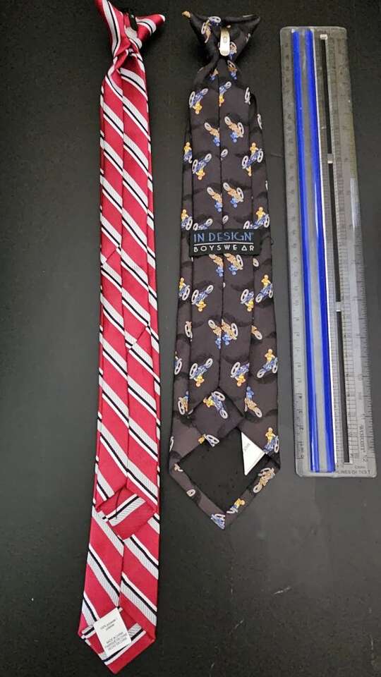 The maroon tie is 16 inches long and the bike tie is 12 inches long. Excellent condition.
