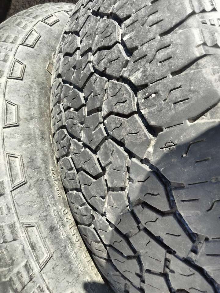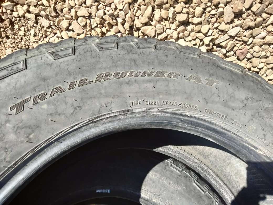 I have two Goodyear Wrangler trail runner AT all terrain all season tires size LT 275/65R20 with a spring of 2021 date code... These excellent all-weather tires have about 8/32 tread and have no cracks checkering or weathering or plugs or abnormalities... These 275/65/20 tires are 10 ply... load range E. I am in Heber but I'm often in Wasatch Weber Davis Summit Utah and Salt Lake counties. I can often meet and sometimes even deliver. Please text or call 801-623-2458. Thank you for your consideration.. I do take venmo or credit cards.