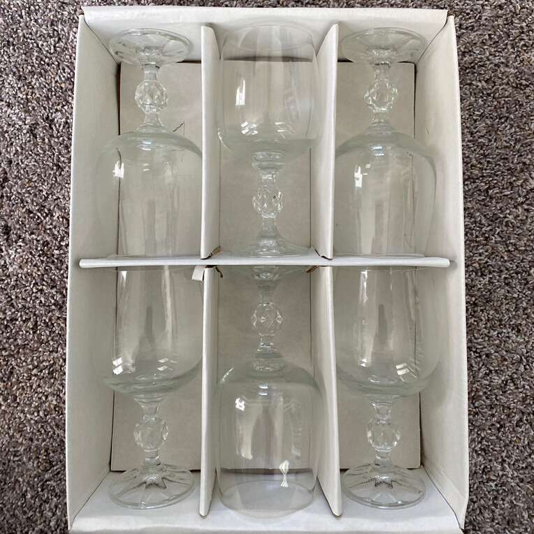 I have two sets of 6 Crystal goblets. One set is 190 ml, the other is 340 ml. In great condition. No chips or cracks. $15 for the large set and $10 for the small set.