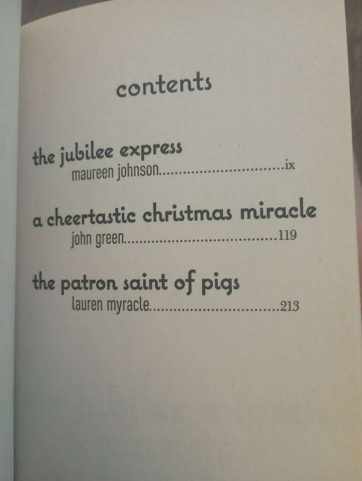 Venmo3 books in 1~ 3 teen holiday romances~ in one small paperback book. The Jubilee Express by Maureen Johnson A Cheertastic Christmas Miracle by John Green The Patron Saint of Pigs by Lauren Miracle. In excellent condition and from a smoke-free home. $2 cash or Venmo. Will hold with Venmo. Text if interested.