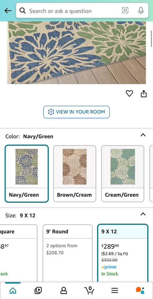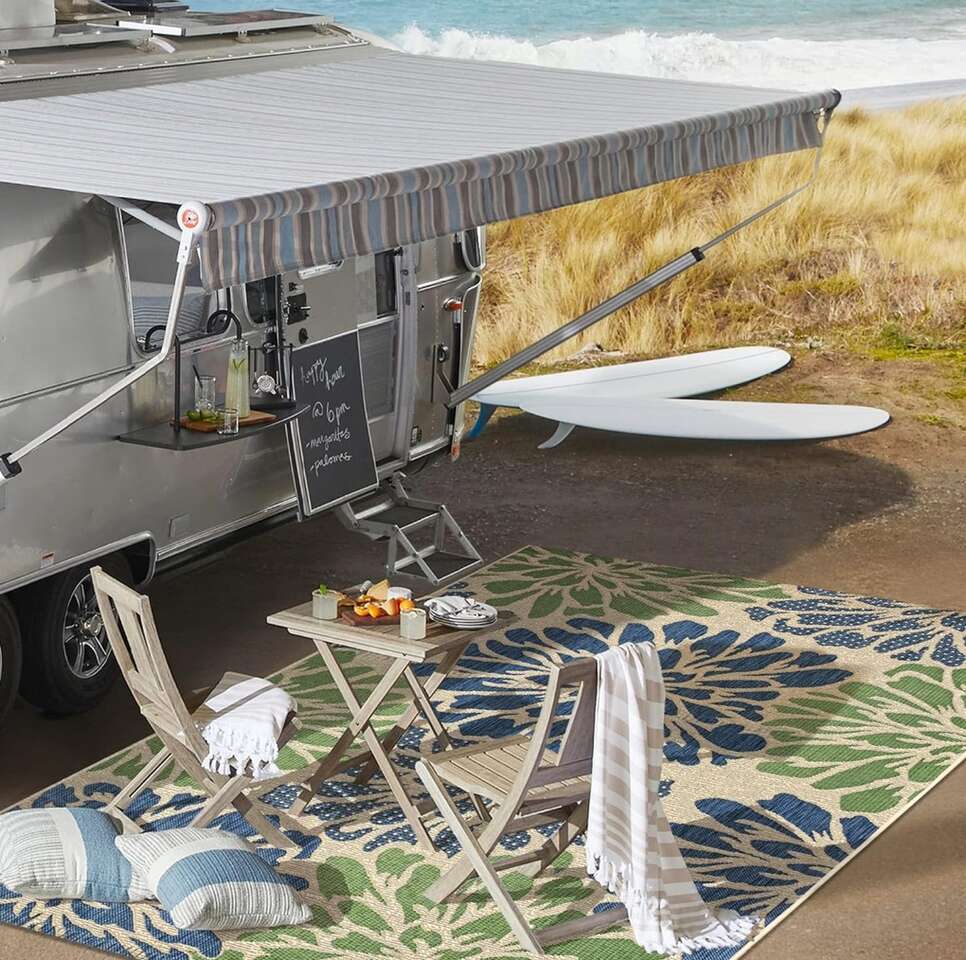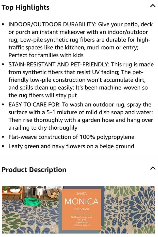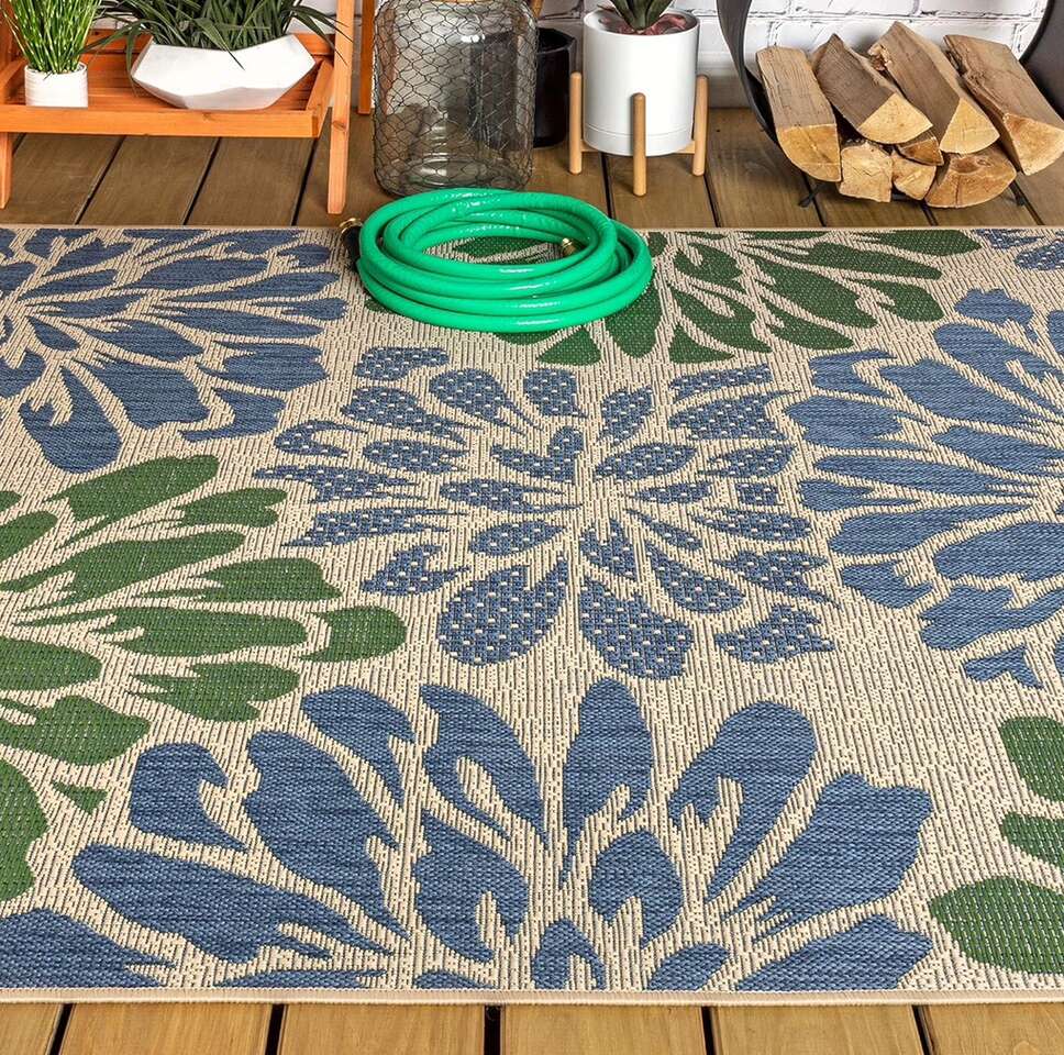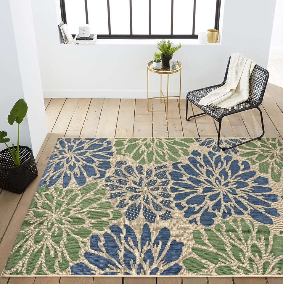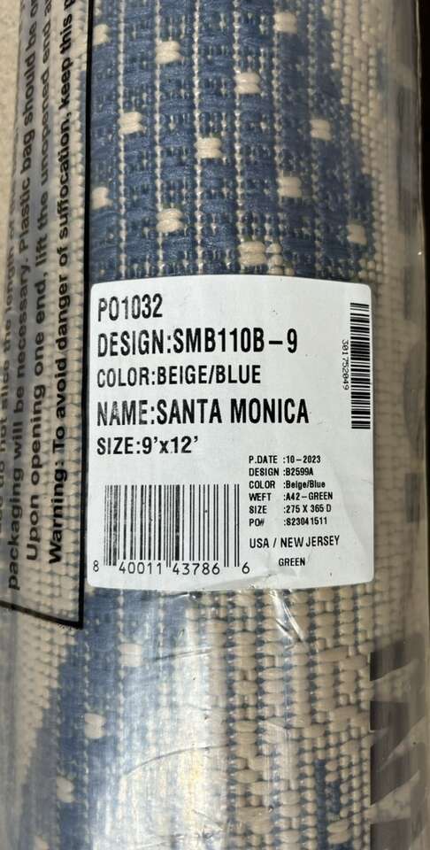 Description- Santa Monica 9’ x 12’ modern floral textured weave indoor/outdoor area rug in beige/blue/green. See photos for more product information and specifications.