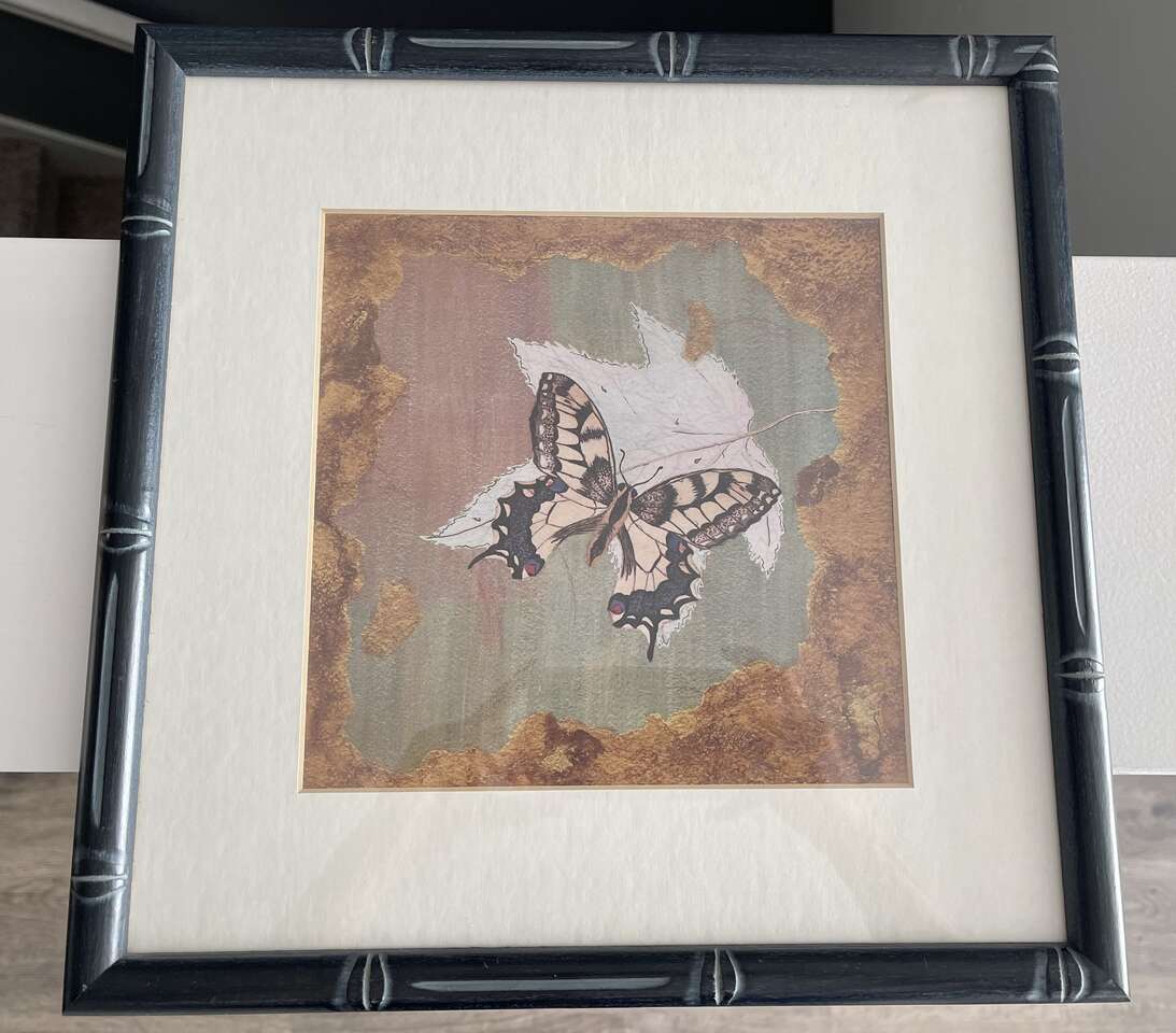 VenmoBeautiful nature inspired matted and framed art print, with butterfly over a tree leaf in nice neutral colors of the forest. Frame is black detailed like bamboo. Excellent like new condition. Hanging hardware attached on the back. 13" square