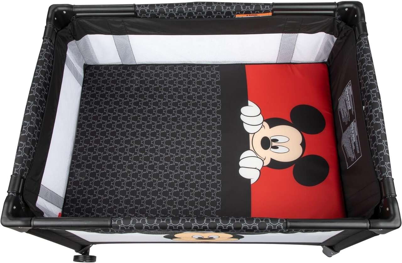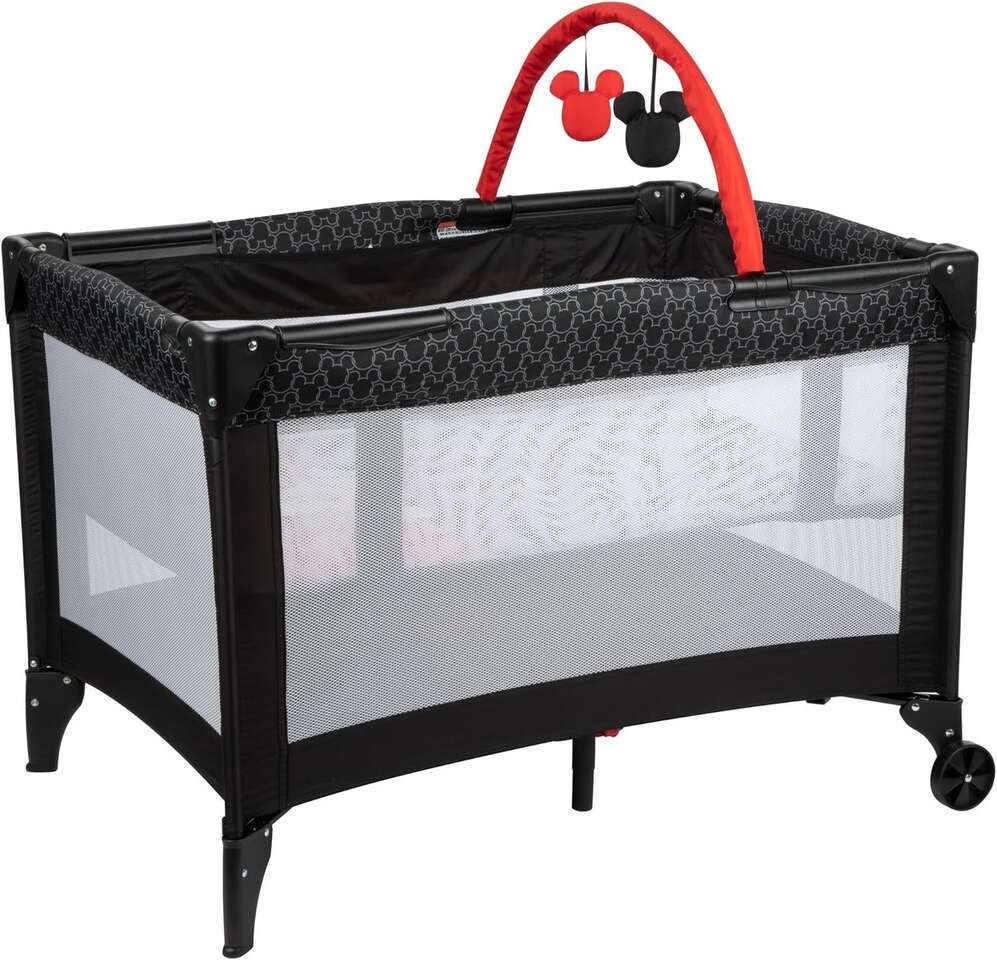 Your child will have fun playing at home or anywhere you travel with the Disney Ultra 3D Play Yard that’s easy to set up in just minutes. Stylish and cute in pink and black, this mini nursery is both a cozy bassinet and full-size play yard that gives baby plenty of space to nap or play. The bassinet comforts your resting child and has an open-view, breathable mesh with an adorable Mickey graphic. After naptime is over the play yard features delightful Disney toys that swing on a detachable toy bar to amuse your little one. You can also easily move the play yard from room to room with two built-in wheels for mobility. When you’re out and about, the compact fold and carry bag make it easy to toss in the trunk and take along for the ride.This product is designed with a firm, flat sleeping surface that meets the Consumer Product Safety Commission’s recommendations for safe sleep.