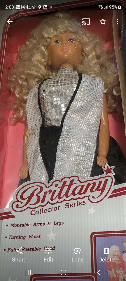 I HAVE 2 OF THESE 36 INCH TALL BRITTANY COLLECTOR SERIES DOLLS IN DIFFERENT COLOR DRESSES. FROM THE 90'S. MOVEABLE ARMS AND LEGS, TURNING WAIST AND FULLY POSEABLE HEAD. GREAT CONDITION. BOX INCLUDED. ONLY $60. EACH.