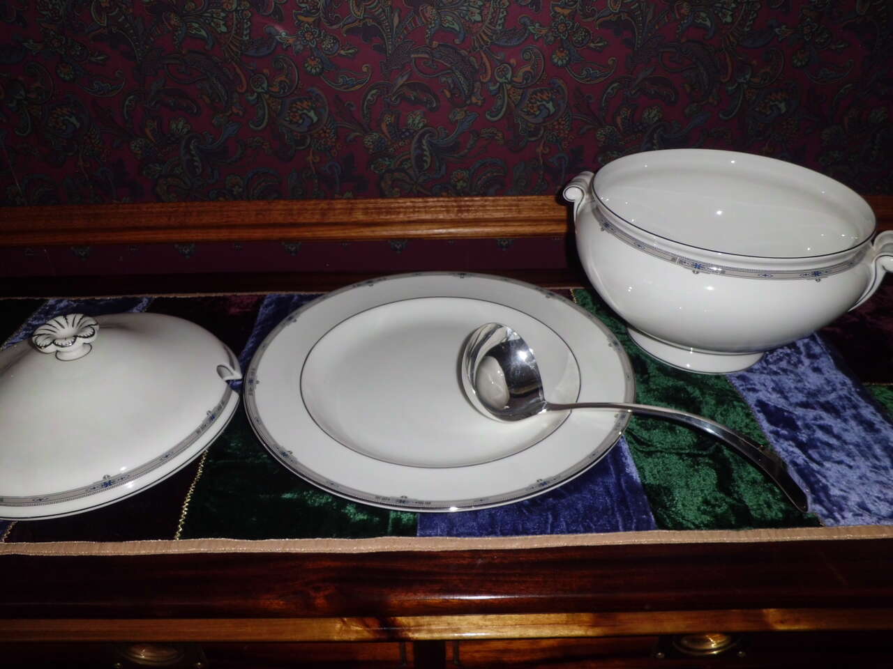 Soup Tureen w/silver plate laddle and plate. Wedgewood patter is Amherst. The plate under the tureen can also be used as a serving platter. Other serving pieces are also available as is a full setting for 12. Made in England.