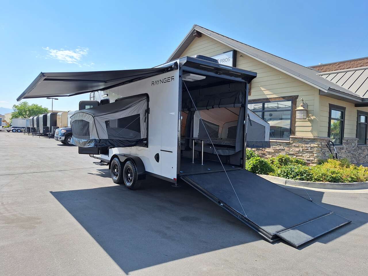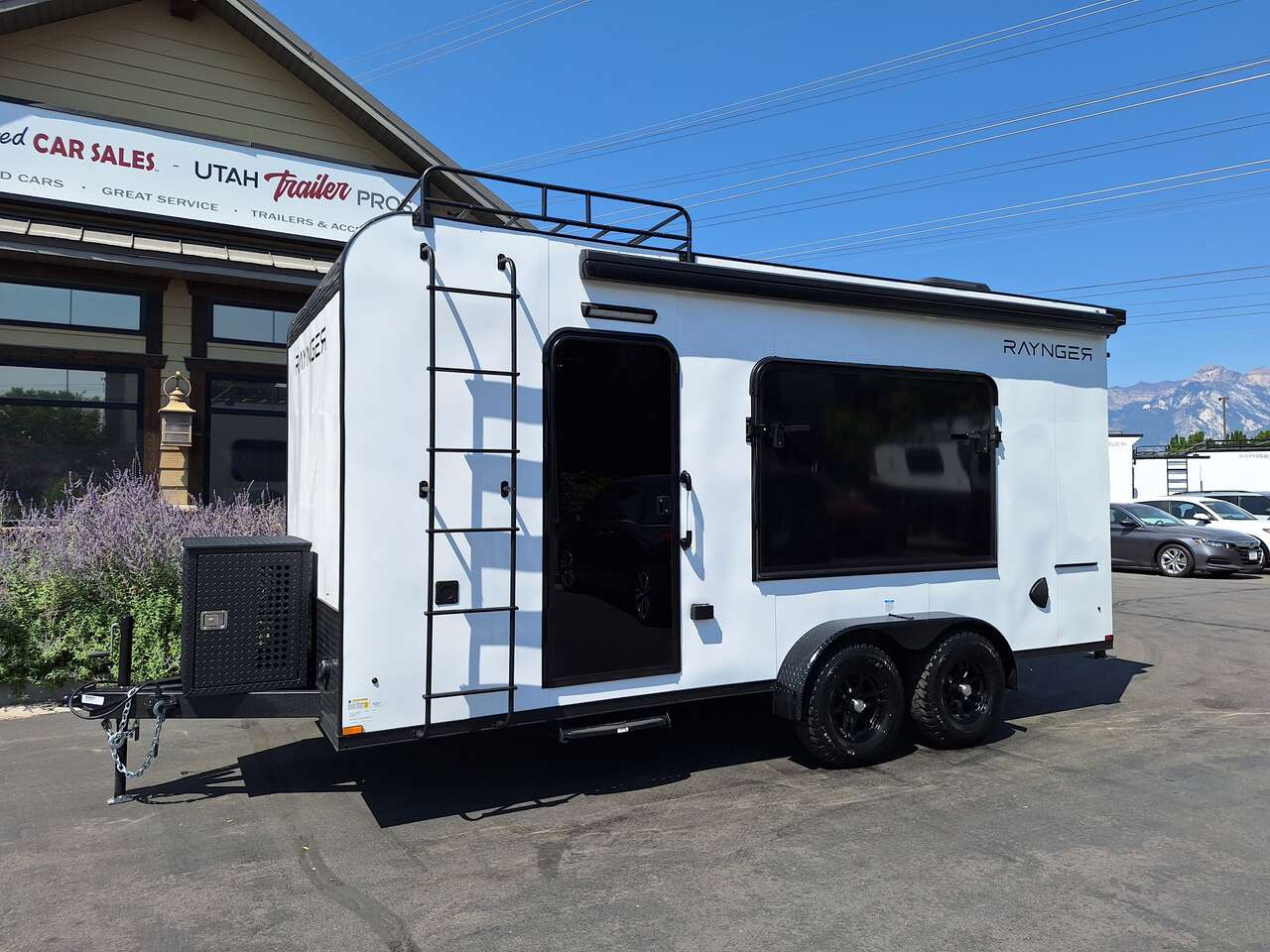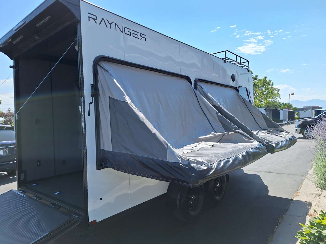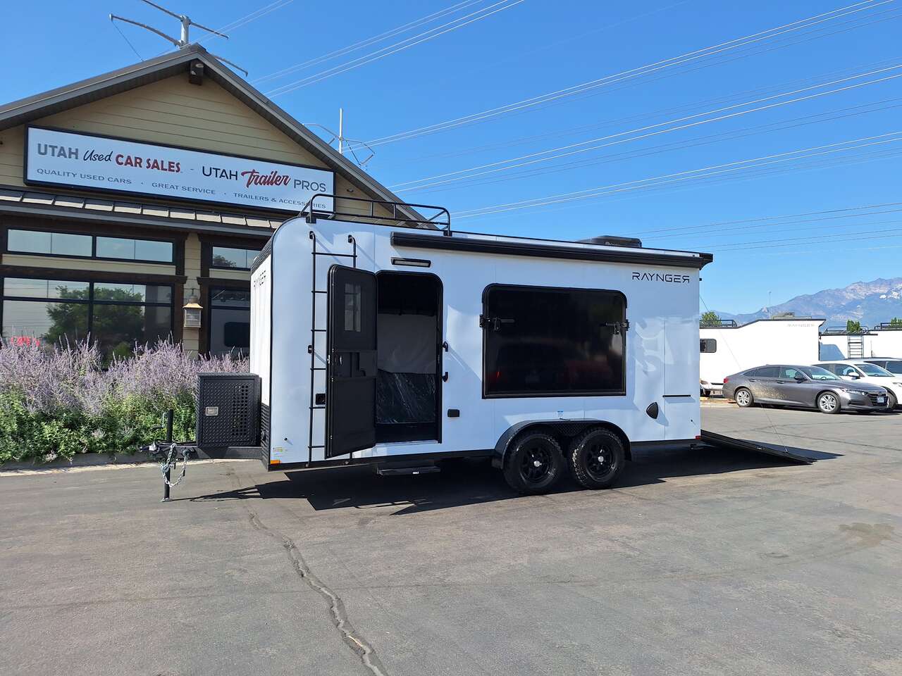 LIMITED TIME $384 A MONTH WITH ZERO DOWN WITH OUR SPECIAL LOCAL CREDIT UNION PARTNER!!! NO PRE-PAYMENT PENALTIES!!! SLEEPS 6!!! 3x POP OUT TENT/BEDS!!! NEW 2025 MODEL!!! WILL FIT ANY STOCK SIDE BY SIDE UTV!!! RAYNGER PREMIUM OFF ROAD TOY HAULER CAMPER!!! 18 INCH GROUND CLEARANCE!!! OFF ROAD TIRES!!! FULLY INSULATED!!! HEATING AND A/C!!! WET SOUND STEREO!!! TWO FOLD OUT/POP OUT TENTS WITH MATTRESS!!! CARGO BASKET!!! LED LIT AWNING!!! 84 Inch Rear Entry Height/87 INCH INTERIOR HEIGHT!!! 77 Inch Rear Entry Width!!! Aluminum Ventilated Locking Generator Box!!! UPGRADED TORSION AXLES!!! 14.2 Foot Long Garage Space!!! And Much MUCH MORE!!! Check out our Specs!!! Also available in 18 foot models. 18 Foot Models can have 3 Fold Out Beds/Pop Out Tents. 16 Foot and 18 Foot Models will fit ANY stock 4 Seater Side by Side • 6” I Beam Frame• Flat Top Design• Flat Front Design• Wall Posts 16” on Center• Cross Members 16” on Center• Roof Bows 16” on Center• Rust Inhibiting Z-Tech Protection on Chassis• Ameraguard on Tongue• Ameraguard on Rear Bumper• Ameraguard Around All Door Openings and Stepwell• Ameraguard Around Edges of Ramp Door• 3500 LB Spring Axles• 2-5/16” Coupler• One-Piece Aluminum Roof• ST235/75R15 Aluminum Wheels with Chrome Center Caps• 2000# Ramp Door with Eberhard Latch• 30” Tempered Glass RV Door with Screen Door• .030 Exterior Metal with Screwless Sides• 24” Black Stoneguard• 3” Black Bottom Trim• Sand Pad• Black Door Hold• 2.7mm Charcoal Textured Vinyl Ceiling • 9mm Charcoal Textured Vinyl Walls• 3/4” Engineered Wood Floor with Rubber Coin Overlay• (6) 1200 LB Floor D rings Installed with Backer Plates• LED Clearance Lights and Tail Lights• LED Back-up Lights• No Show Wheel Box• Spoiler with Toggle Switch• RV Step• 7’ Interior• (2) 17” Chrome Base Lights with Switch• (1) Black 17” Spot Light with Switch• (1) 30 Amp Panel with Marine Plug• A/C Unit with Heat Strip• (3) Interior Recepts• (1) Exterior Recept• 12V Battery and Charge Line• Prep for Backup Camera• Wet Sounds System• (3) Blue Interior Cabinet Lights• (1) 6’ Section of Flex Lights• Black ATP Rear Header and Hoop• Black ATP Fenders• Insulated Walls & Ceiling• Base Cabinets• Overhead Cabinets with Netting Over Compartments• Pop Out Tent• Black ATP Storage/Generator Box Mounted On Tongue