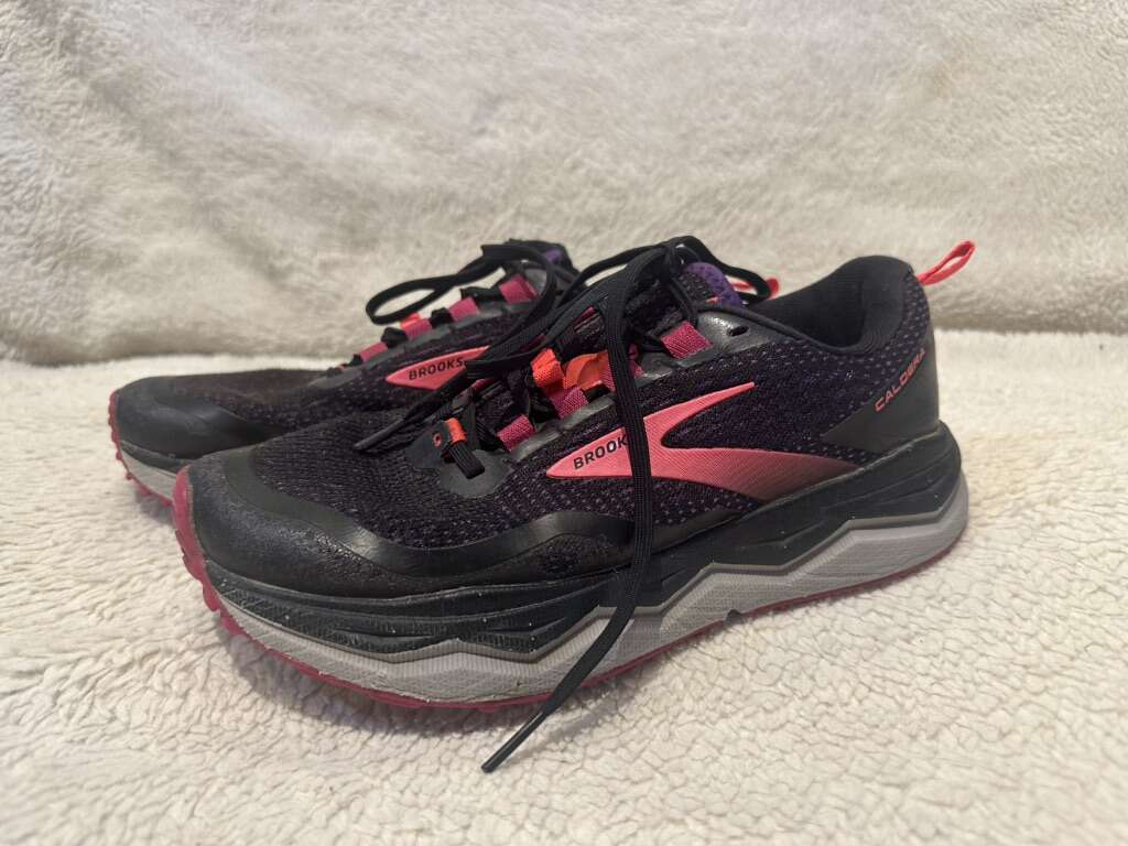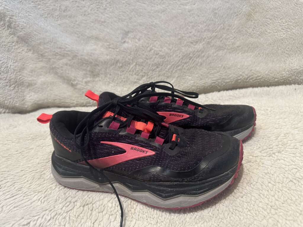 Brooks Caldera women’s size 8 black with purple and salmon trim trail or hiking shoes. These are in good condition. See photos for details. I take cash or Venmo, but cash is preferred. Text is best. 8012014446. Check out my other ads for additional sizes and styles.