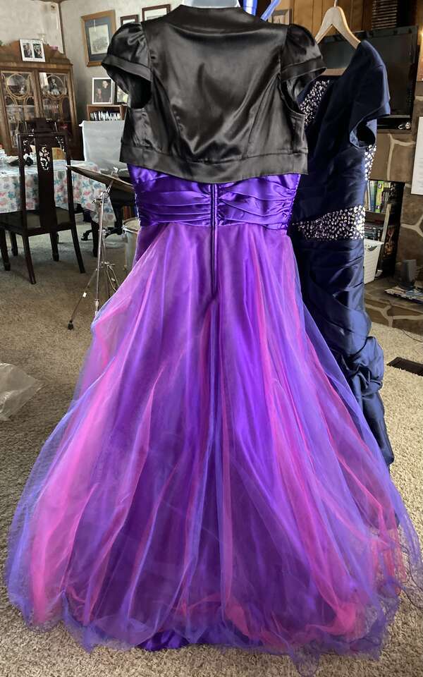 Elegant Purple Satin Bodice with three layers of purple and bright pink toulle for a full skirt from waist to floor. Translucent jewels adorn the bodice in a classic floral pattern.