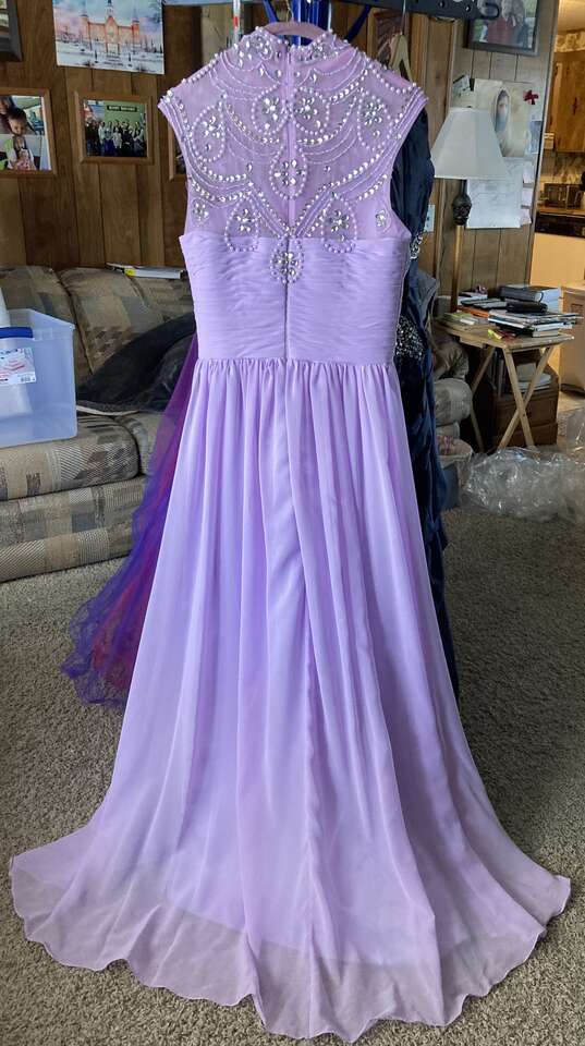 High Collared Lavender Gown with bead and gem work for a most elegant and classic look. An A-Line High-Low Skirt with a small train in the back completes the beautiful gown. Worn only once. Perfect for formal dances, weddings, or Quinceañeras.