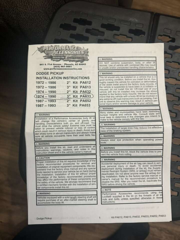 Complete 3in body lift for older dodge tracks and ramcharger brand new in the box.