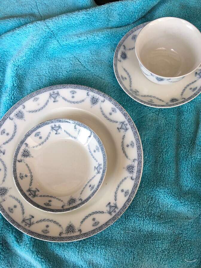 Antique 1800’s English dinnerware. Set of 6 plates, bowls, saucers, cups, platter, serve bowl, gravy