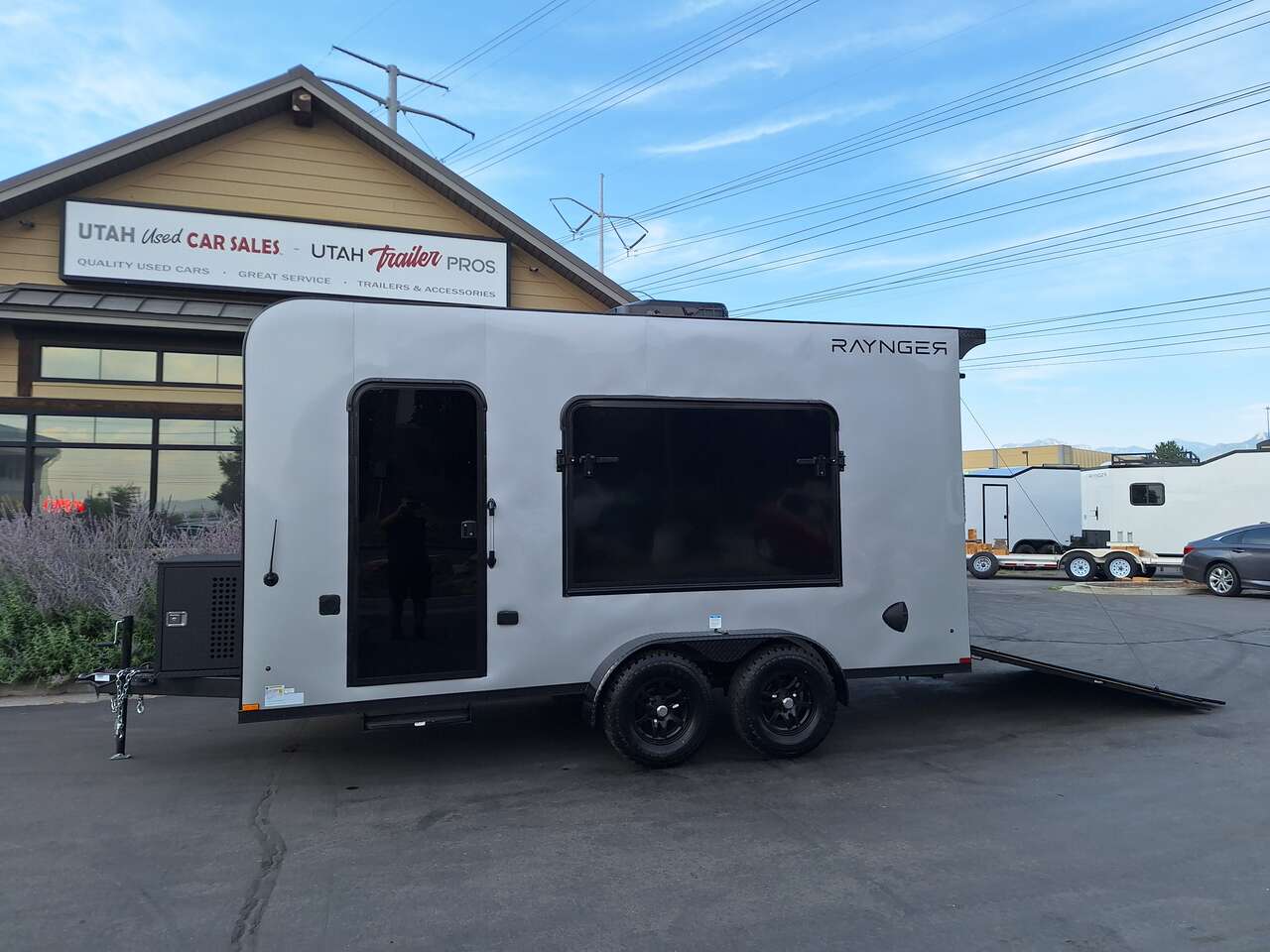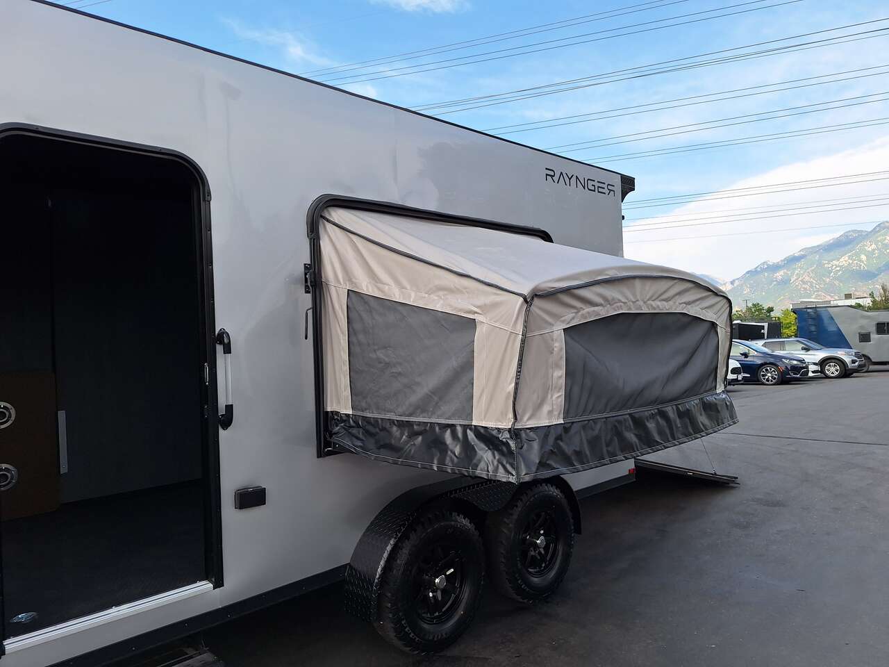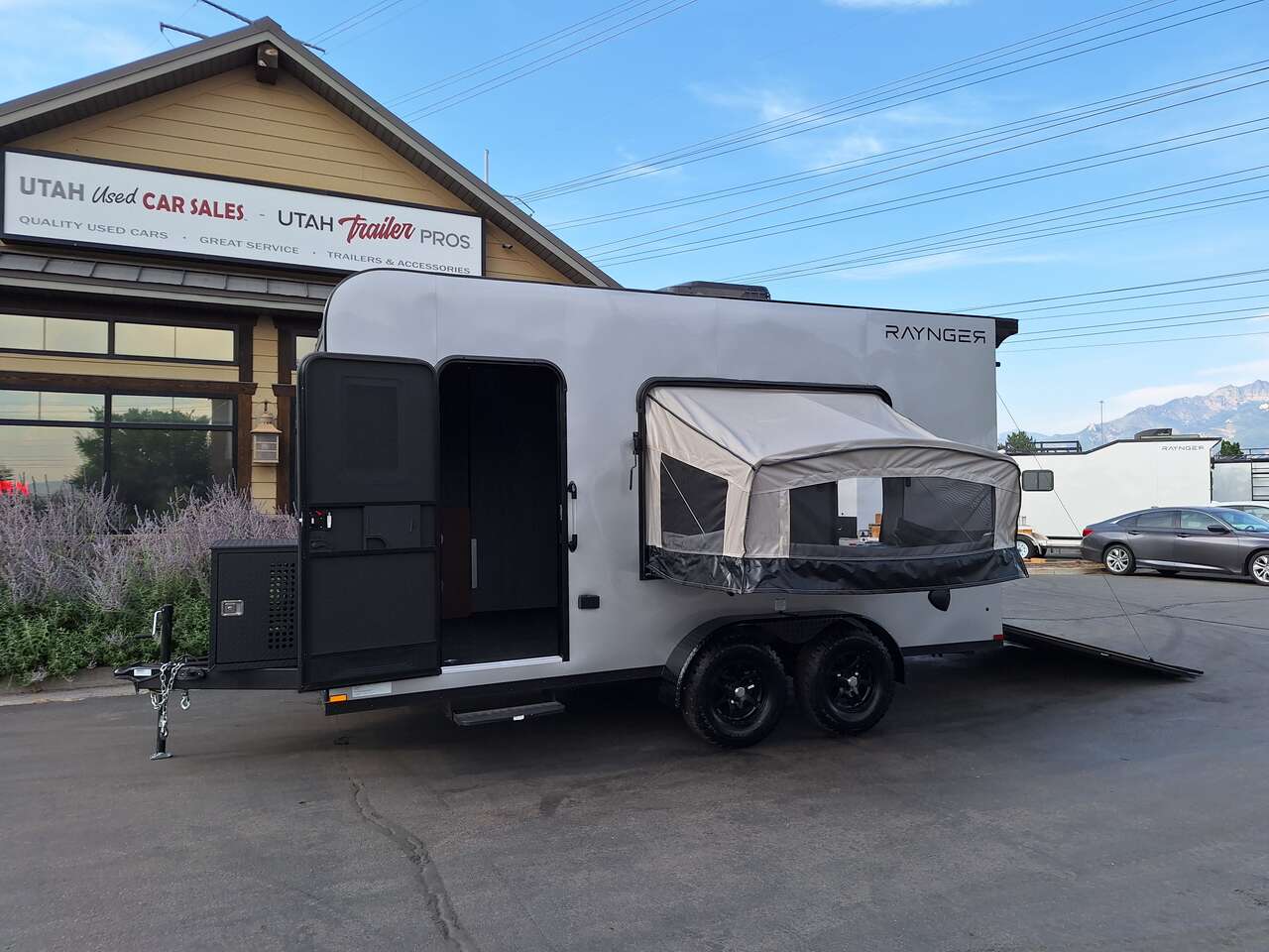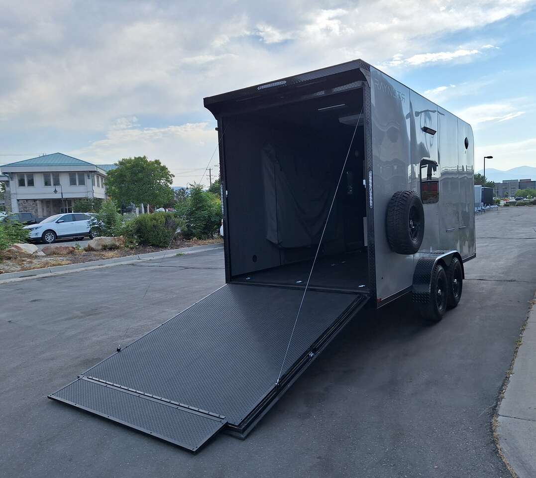 LIMITED TIME $185 A MONTH WITH ZERO DOWN WITH OUR SPECIAL LOCAL CREDIT UNION PARTNER!!! NO PRE-PAYMENT PENALTIES!!! NEW 2025 MODEL!!! FITS ANY STOCK SIDE BY SIDE UTV!!! RAYNGER PREMIUM OFF ROAD TOY HAULER CAMPER!!! 18 INCH GROUND CLEARANCE!!! OFF ROAD TIRES!!! FULLY INSULATED!!! HEATING AND A/C!!! WET SOUND STEREO!!! FOLD OUT/POP OUT TENT WITH MATTRESS!!! 84 Inch Rear Entry Height/87 INCH INTERIOR HEIGHT!!! 77 Inch Rear Entry Width!!! Aluminum Ventilated Locking Generator Box!!! UPGRADED TORSION AXLES!!! 14.2 Foot Long Garage Space!!! And Much MUCH MORE!!! Check out our Specs!!! Also available in 18 foot models. 18 Foot Models can have 3 Fold Out Beds/Pop Out Tents. 16 Foot and 18 Foot Models will fit ANY stock 4 Seater Side by Side • 6” I Beam Frame• Flat Top Design• Flat Front Design• Wall Posts 16” on Center• Cross Members 16” on Center• Roof Bows 16” on Center• Rust Inhibiting Z-Tech Protection on Chassis• Ameraguard on Tongue• Ameraguard on Rear Bumper• Ameraguard Around All Door Openings and Stepwell• Ameraguard Around Edges of Ramp Door• 3500 LB Spring Axles• 2-5/16” Coupler• One-Piece Aluminum Roof• ST235/75R15 Aluminum Wheels with Chrome Center Caps• 2000# Ramp Door with Eberhard Latch• 30” Tempered Glass RV Door with Screen Door• .030 Exterior Metal with Screwless Sides• 24” Black Stoneguard• 3” Black Bottom Trim• Sand Pad• Black Door Hold• 2.7mm Charcoal Textured Vinyl Ceiling • 9mm Charcoal Textured Vinyl Walls• 3/4” Engineered Wood Floor with Rubber Coin Overlay• (6) 1200 LB Floor D rings Installed with Backer Plates• LED Clearance Lights and Tail Lights• LED Back-up Lights• No Show Wheel Box• Spoiler with Toggle Switch• RV Step• 7’ Interior• (2) 17” Chrome Base Lights with Switch• (1) Black 17” Spot Light with Switch• (1) 30 Amp Panel with Marine Plug• A/C Unit with Heat Strip• (3) Interior Recepts• (1) Exterior Recept• 12V Battery and Charge Line• Prep for Backup Camera• Wet Sounds System• (3) Blue Interior Cabinet Lights• (1) 6’ Section of Flex Lights• Black ATP Rear Header and Hoop• Black ATP Fenders• Insulated Walls & Ceiling• Base Cabinets• Overhead Cabinets with Netting Over Compartments• Pop Out Tent• Black ATP Storage/Generator Box Mounted On Tongue