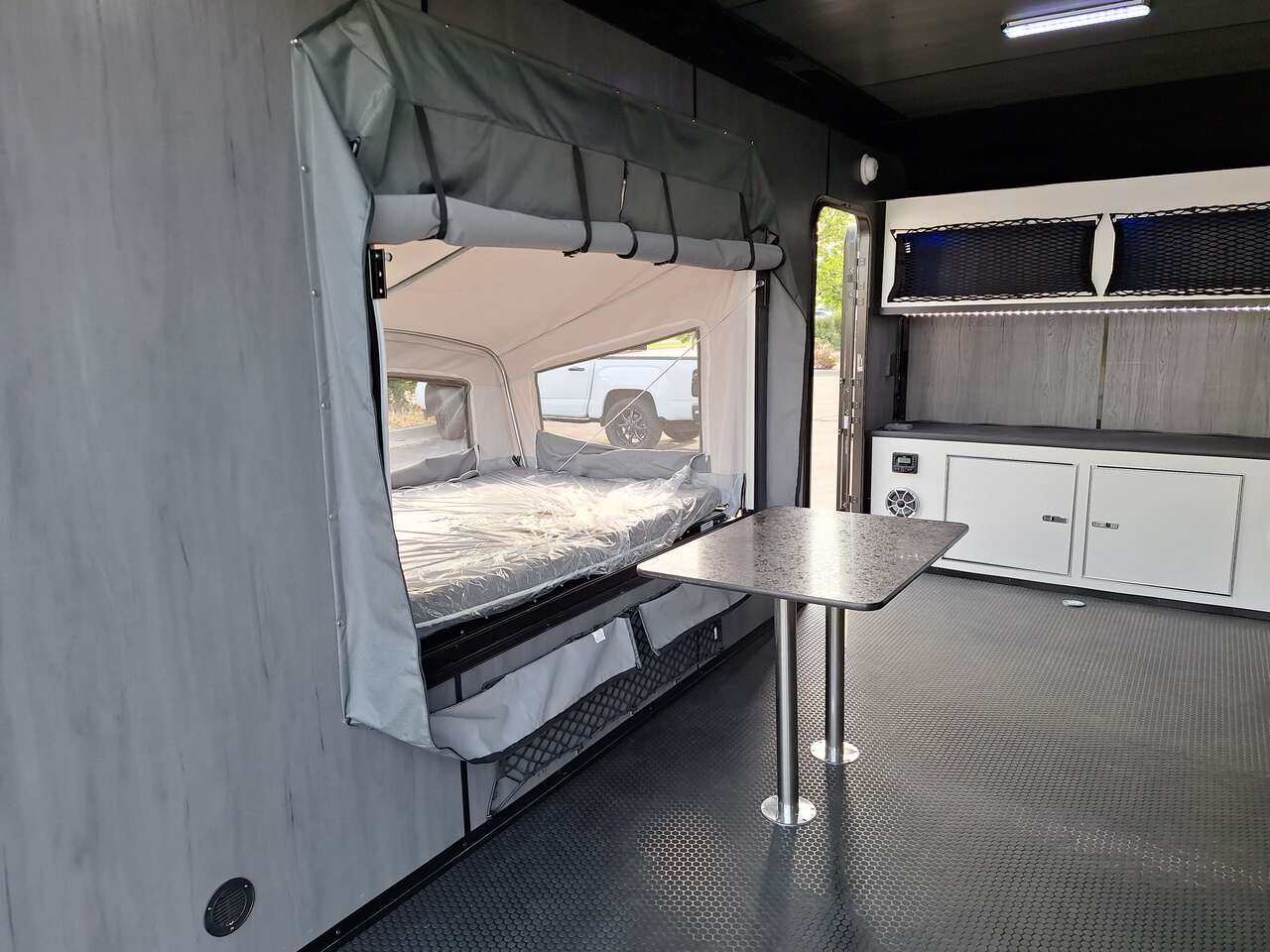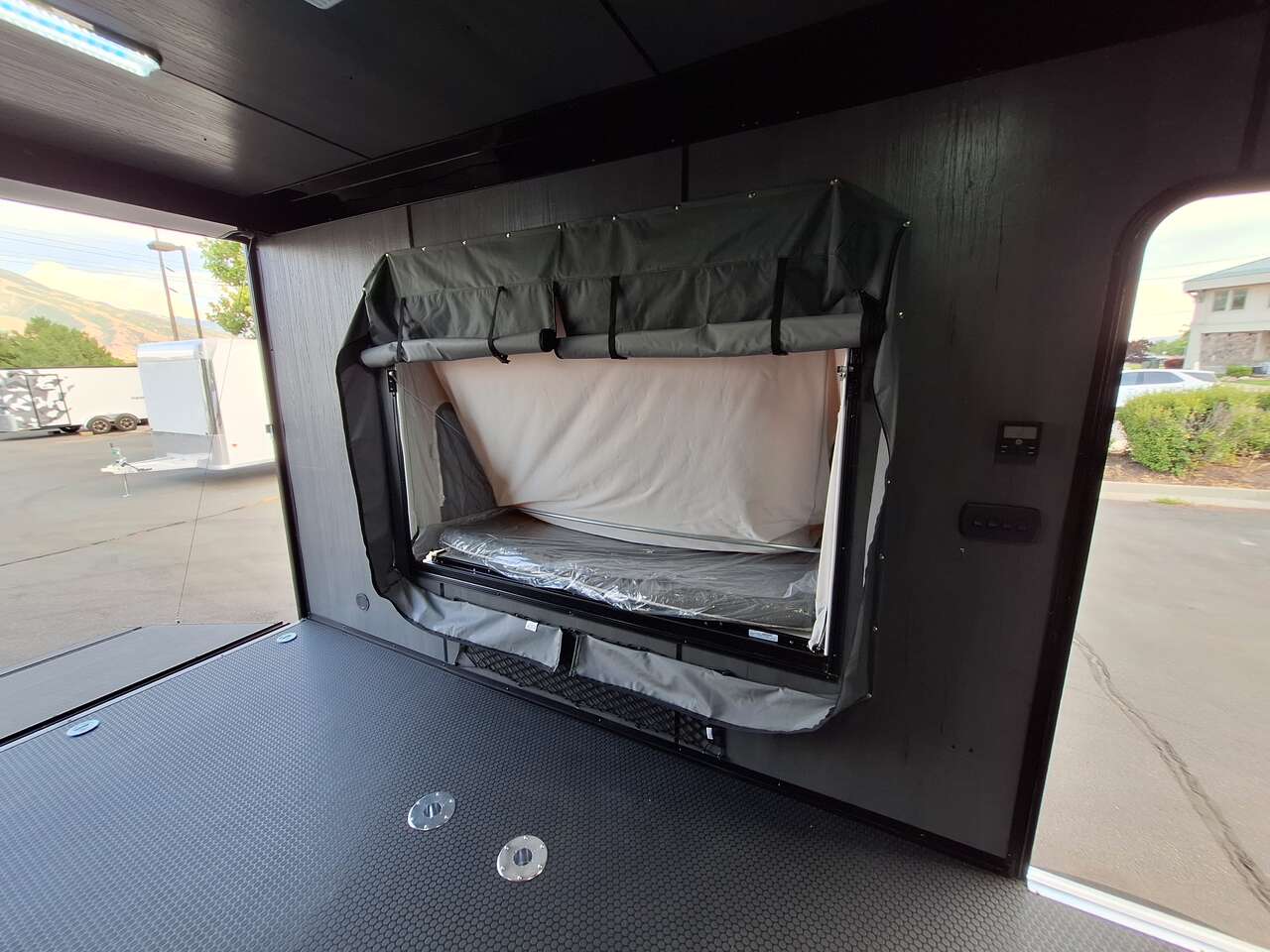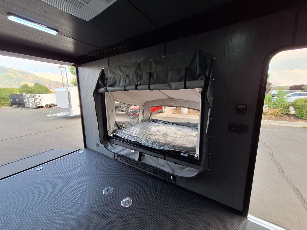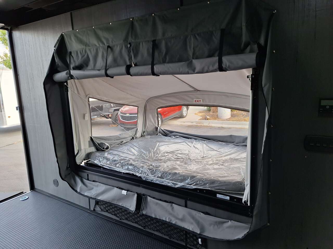 LIMITED TIME $185 A MONTH WITH ZERO DOWN WITH OUR SPECIAL LOCAL CREDIT UNION PARTNER!!! NO PRE-PAYMENT PENALTIES!!! NEW 2025 MODEL!!! FITS ANY STOCK SIDE BY SIDE UTV!!! RAYNGER PREMIUM OFF ROAD TOY HAULER CAMPER!!! 18 INCH GROUND CLEARANCE!!! OFF ROAD TIRES!!! FULLY INSULATED!!! HEATING AND A/C!!! WET SOUND STEREO!!! FOLD OUT/POP OUT TENT WITH MATTRESS!!! 84 Inch Rear Entry Height/87 INCH INTERIOR HEIGHT!!! 77 Inch Rear Entry Width!!! Aluminum Ventilated Locking Generator Box!!! UPGRADED TORSION AXLES!!! 14.2 Foot Long Garage Space!!! And Much MUCH MORE!!! Check out our Specs!!! Also available in 18 foot models. 18 Foot Models can have 3 Fold Out Beds/Pop Out Tents. 16 Foot and 18 Foot Models will fit ANY stock 4 Seater Side by Side • 6” I Beam Frame• Flat Top Design• Flat Front Design• Wall Posts 16” on Center• Cross Members 16” on Center• Roof Bows 16” on Center• Rust Inhibiting Z-Tech Protection on Chassis• Ameraguard on Tongue• Ameraguard on Rear Bumper• Ameraguard Around All Door Openings and Stepwell• Ameraguard Around Edges of Ramp Door• 3500 LB Spring Axles• 2-5/16” Coupler• One-Piece Aluminum Roof• ST235/75R15 Aluminum Wheels with Chrome Center Caps• 2000# Ramp Door with Eberhard Latch• 30” Tempered Glass RV Door with Screen Door• .030 Exterior Metal with Screwless Sides• 24” Black Stoneguard• 3” Black Bottom Trim• Sand Pad• Black Door Hold• 2.7mm Charcoal Textured Vinyl Ceiling • 9mm Charcoal Textured Vinyl Walls• 3/4” Engineered Wood Floor with Rubber Coin Overlay• (6) 1200 LB Floor D rings Installed with Backer Plates• LED Clearance Lights and Tail Lights• LED Back-up Lights• No Show Wheel Box• Spoiler with Toggle Switch• RV Step• 7’ Interior• (2) 17” Chrome Base Lights with Switch• (1) Black 17” Spot Light with Switch• (1) 30 Amp Panel with Marine Plug• A/C Unit with Heat Strip• (3) Interior Recepts• (1) Exterior Recept• 12V Battery and Charge Line• Prep for Backup Camera• Wet Sounds System• (3) Blue Interior Cabinet Lights• (1) 6’ Section of Flex Lights• Black ATP Rear Header and Hoop• Black ATP Fenders• Insulated Walls & Ceiling• Base Cabinets• Overhead Cabinets with Netting Over Compartments• Pop Out Tent• Black ATP Storage/Generator Box Mounted On Tongue