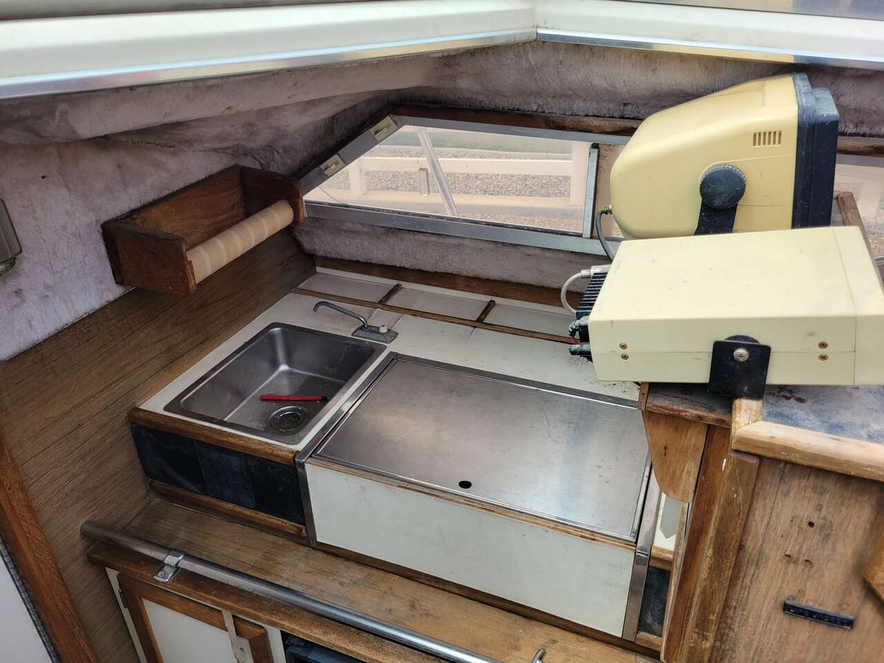 Table and sink in the kitchen area. (Alohol stove was removed berfore we purchased the boat.)