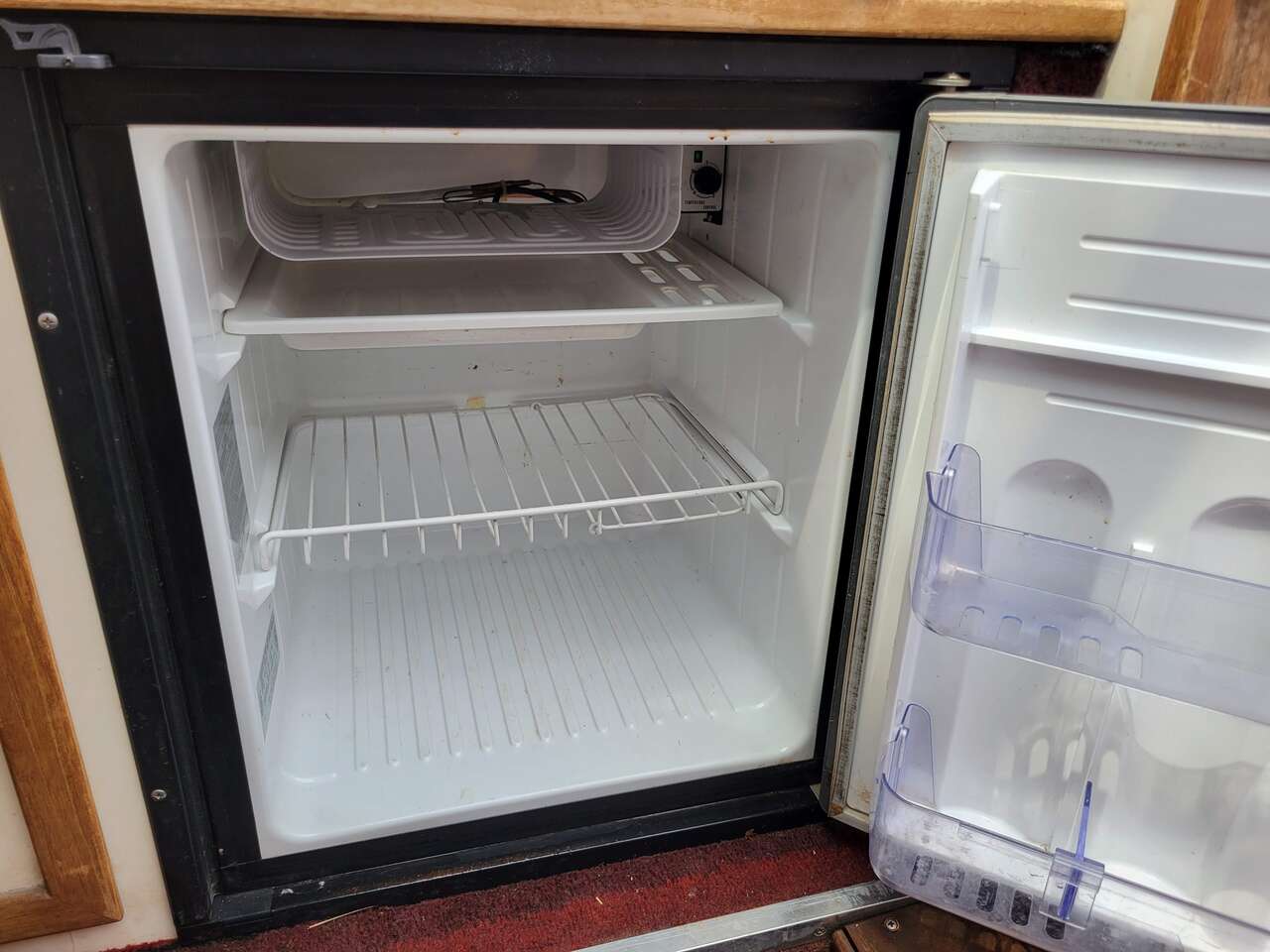Refridgerator to keep food and drinks cold indefinately. Runs on AC shore power or isolated battery dedicated to the refridgerator.