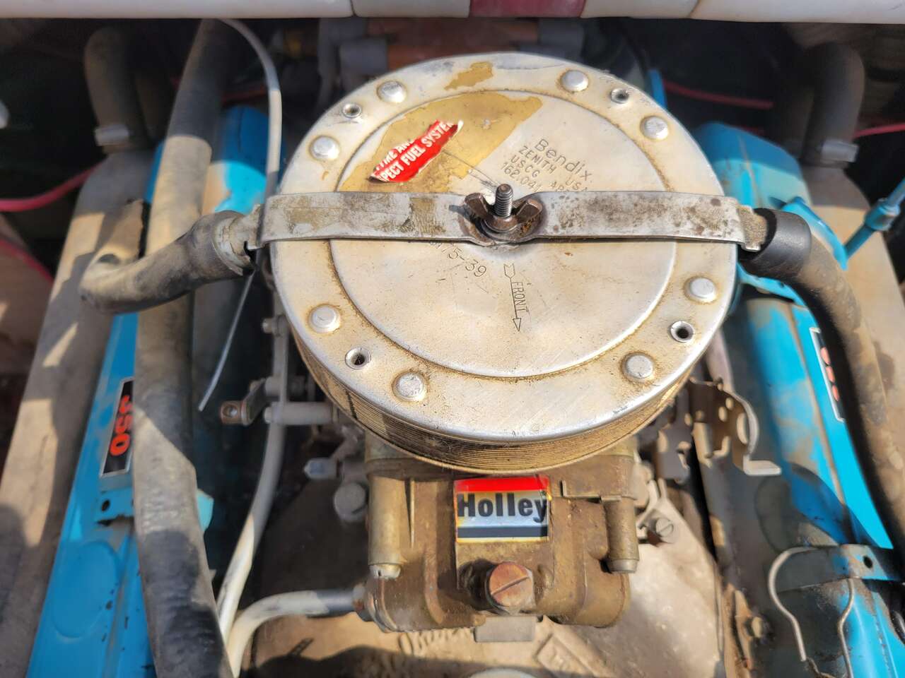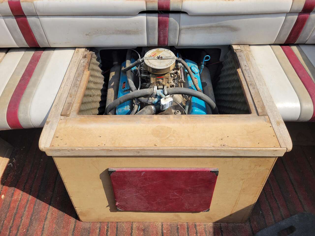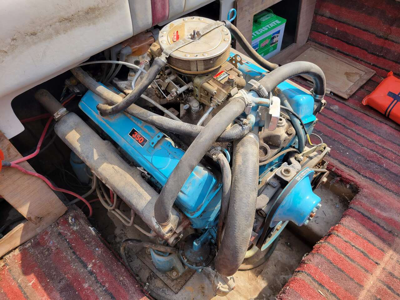 Chevy 350 with Holly double pumper 4 barrel marine carberator gets boat up and moving, but still has amazing fuel efficency.