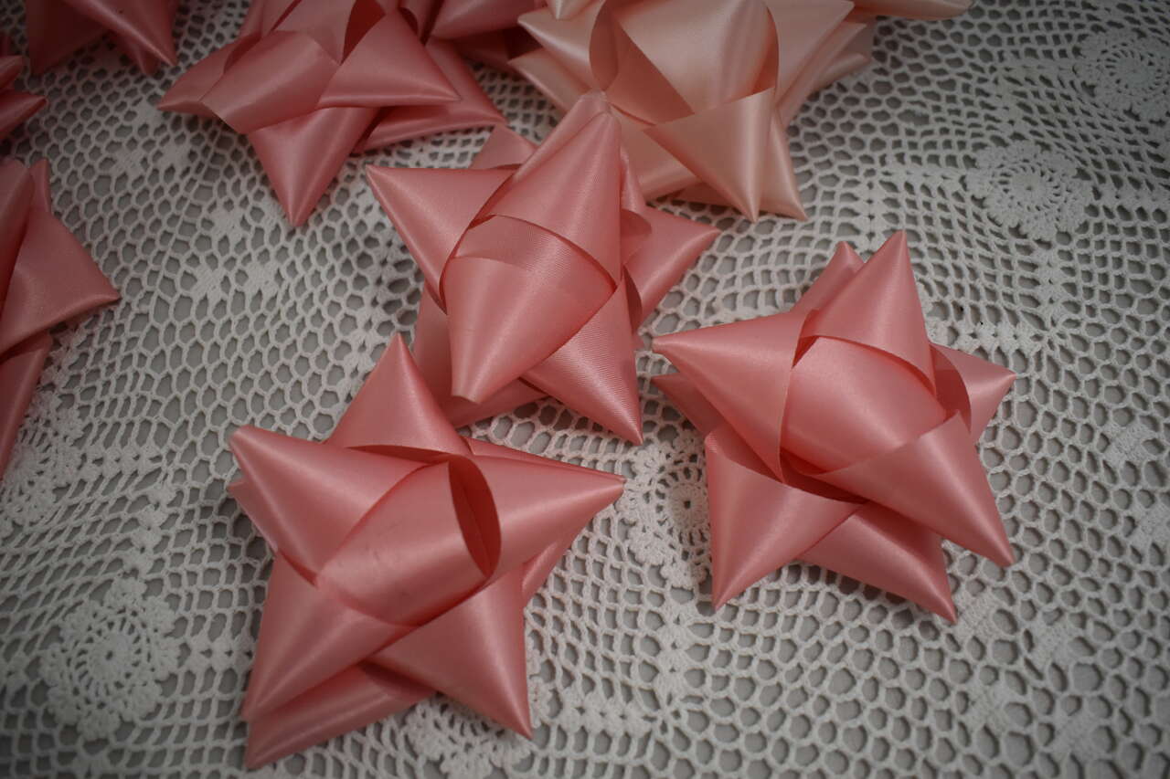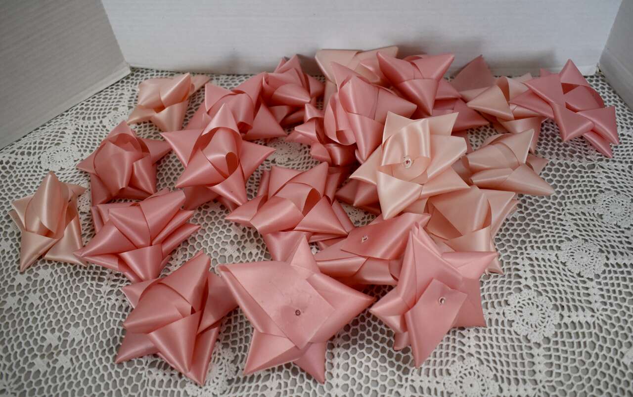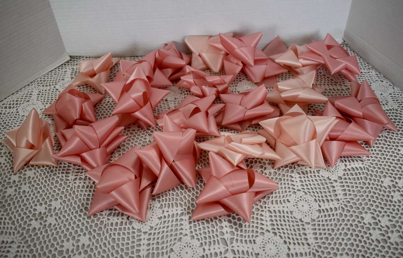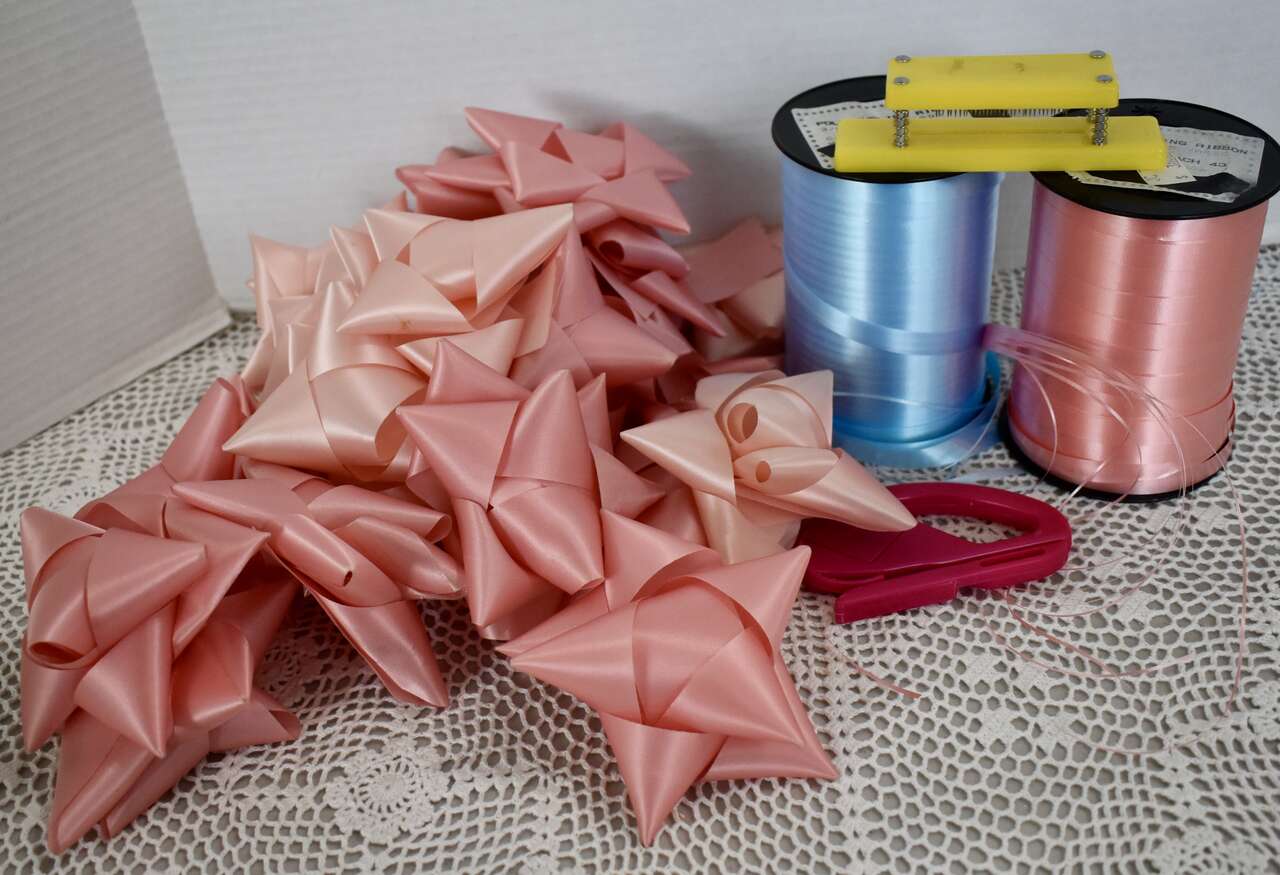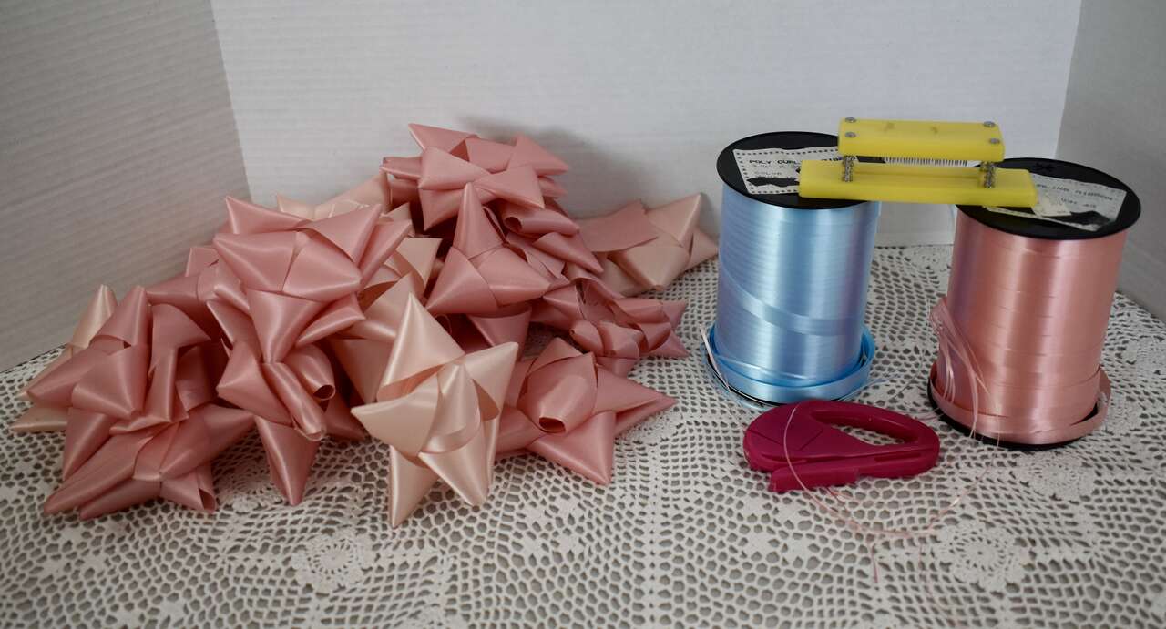 IT MEASURES…The Pink and Blue Curling Ribbon are 3/8 inches wide and each roll still has Way Over 250 Yards still left on each roll to use. ( They originally had 275 yards on each and we used a few yards throughout the years but not much. ) The 23 Pink Pre-made bows are the typical size ( about 4 1/4 to 4 1/2 inches across ) as most ribbon bows but just a whole lot sturdier because of the nice ribbon that they are made out of.