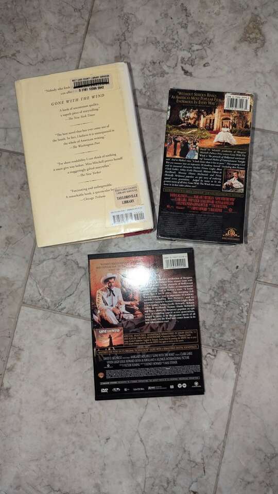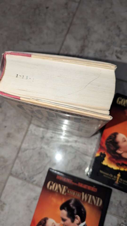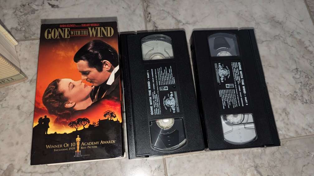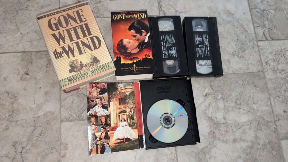 This bundle includes a hardcover copy of the classic novel "Gone with the Wind" by Margaret Mitchell, as well as a sealed VHS and DVD set.