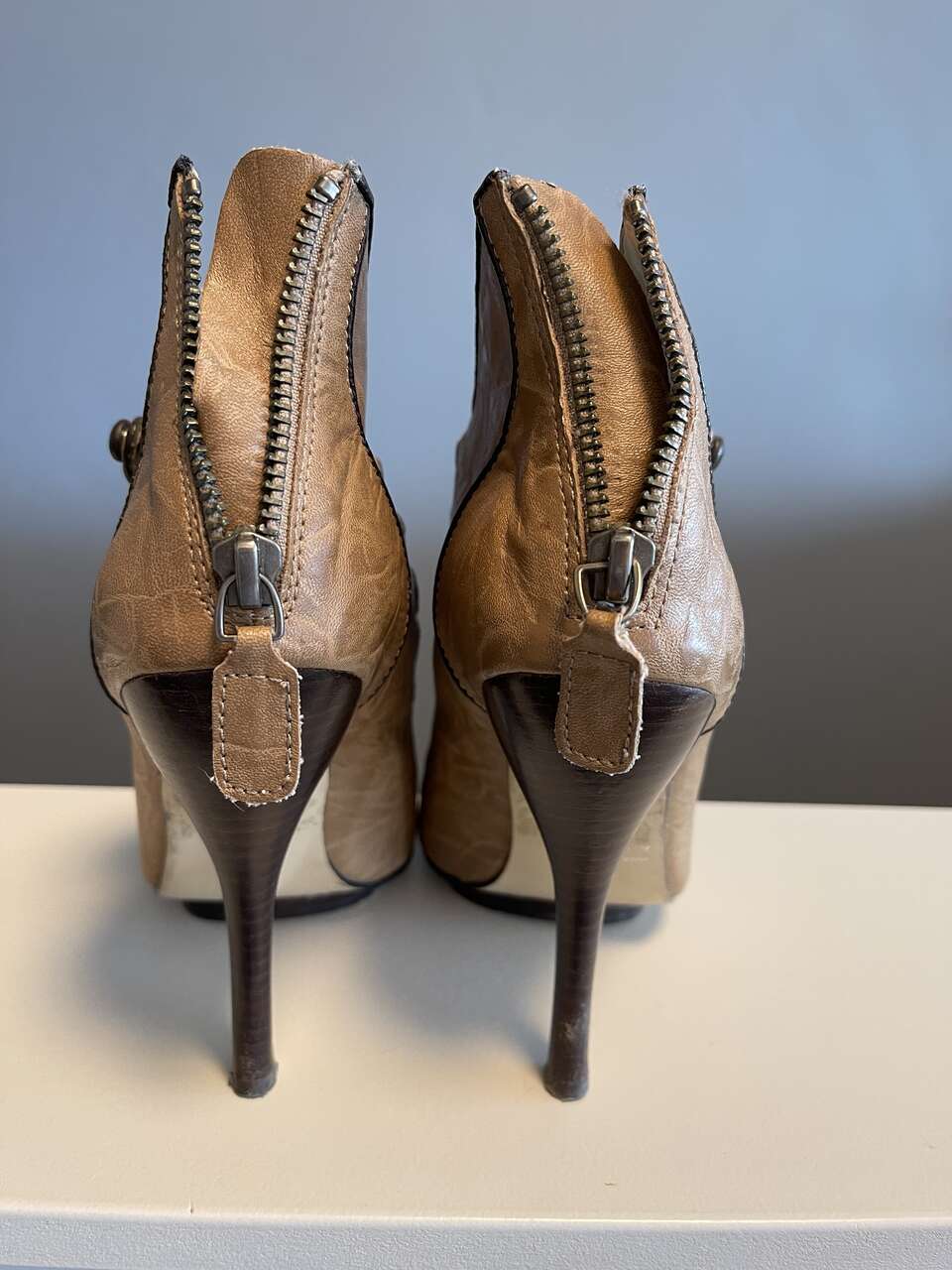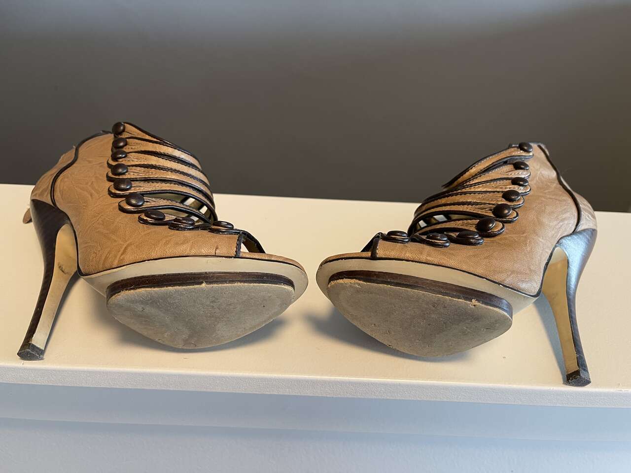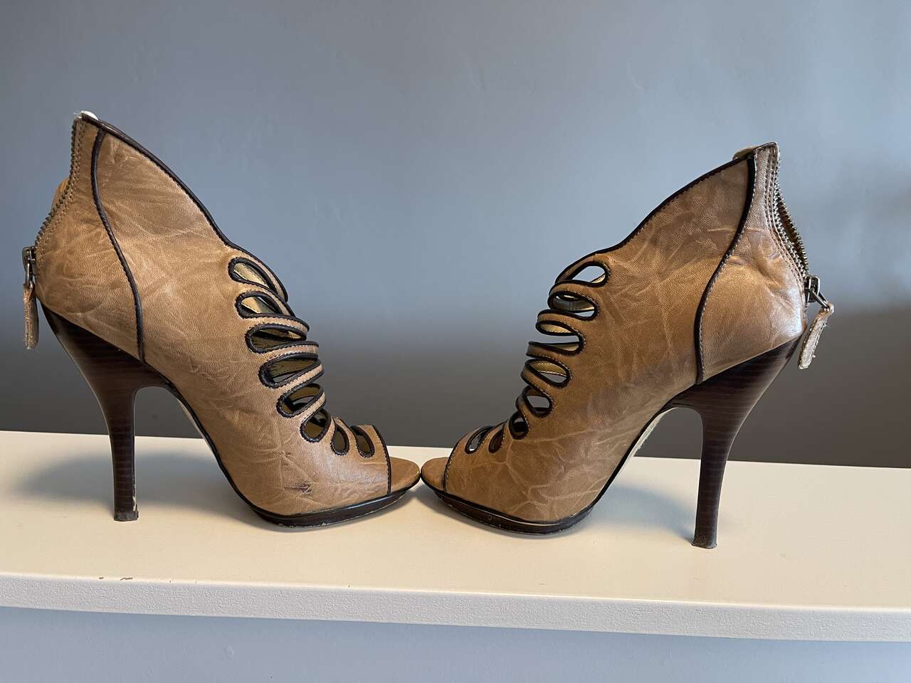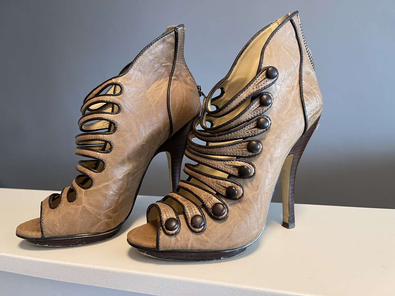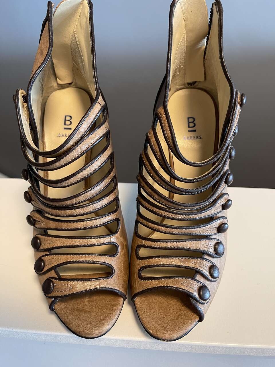 Bakers Victorian vintage strappy dress booties. Camel leather w/ brown buttons, contrasting trim and heels. Peep toe. Zip back. Non-functional buttons. Top straps have some stretch for a custom glove-like fit on your foot. Tall 4 1/2" stiletto heel with 1/4" platform on sole.