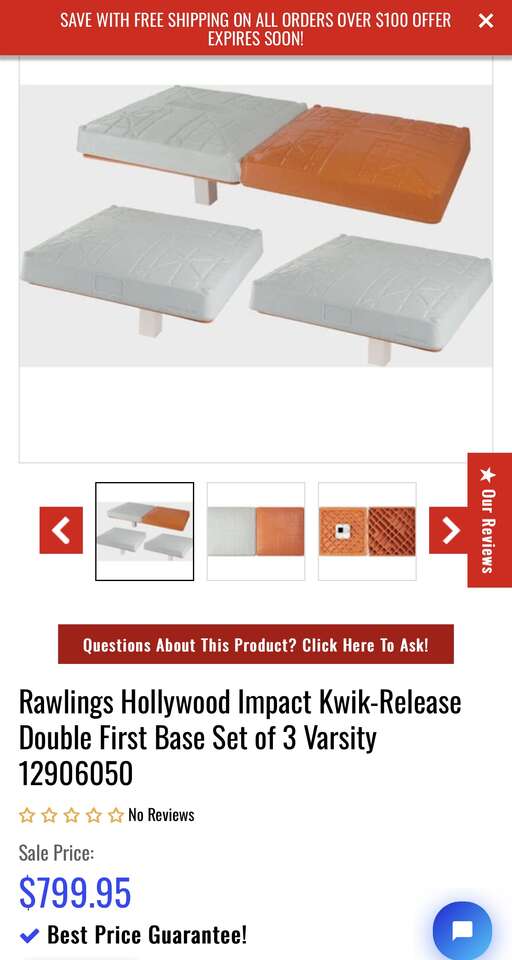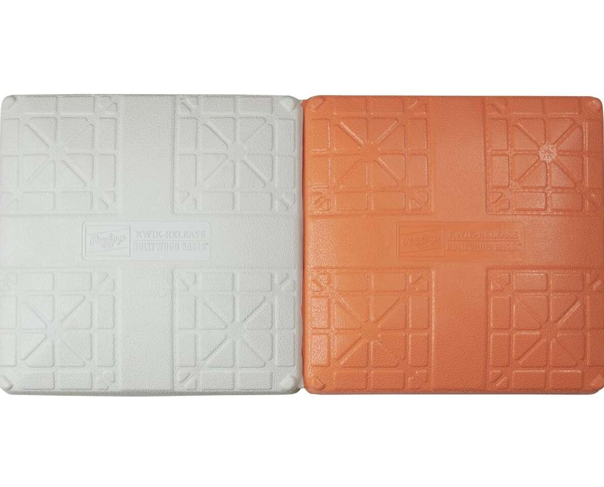 The Rawlings (Schutt) Hollywood Impact Kwik-Release double first base set features a safety design where the top of the base (white) disengages from the bottom base plate (orange) upon a strong impact, greatly reducing the risk of player injury. These varsity level breakaway style bases require 26lbs of force to dislodge the top base from the base plate. This varsity base set includes a Kwik-Release double first base and two Kwik-Release bases, all built with a heavy-duty rubber construction that is built to last. For added safety, the double 1st base design includes a regulation-size white base for fielders and a bright orange regulation-size outside base for baserunners to reduce player collisions. The Kwik-Release safety feature configuration is comprised of interconnecting tabs that connect the top of the base to the bottom platform. The tabs are soft enough for players to slide over when the top base disengages. The double first base has the interconnecting tabs on the white base only. These Kwik-Release bases have a higher resistance to disengage the base than the varsity model (sold separately). The bottom platforms of the bases are equipped with a 6" stanchion for mounting into a ground anchor (sold separately). The double first base has the 6" stanchion attached to the bottom platform that interconnects with the white base only. Rawlings Hollywood Impact Kwik-Release bases are the official recommended base of the Babe Ruth League, Cal Ripken Baseball and are approved for Little League play.