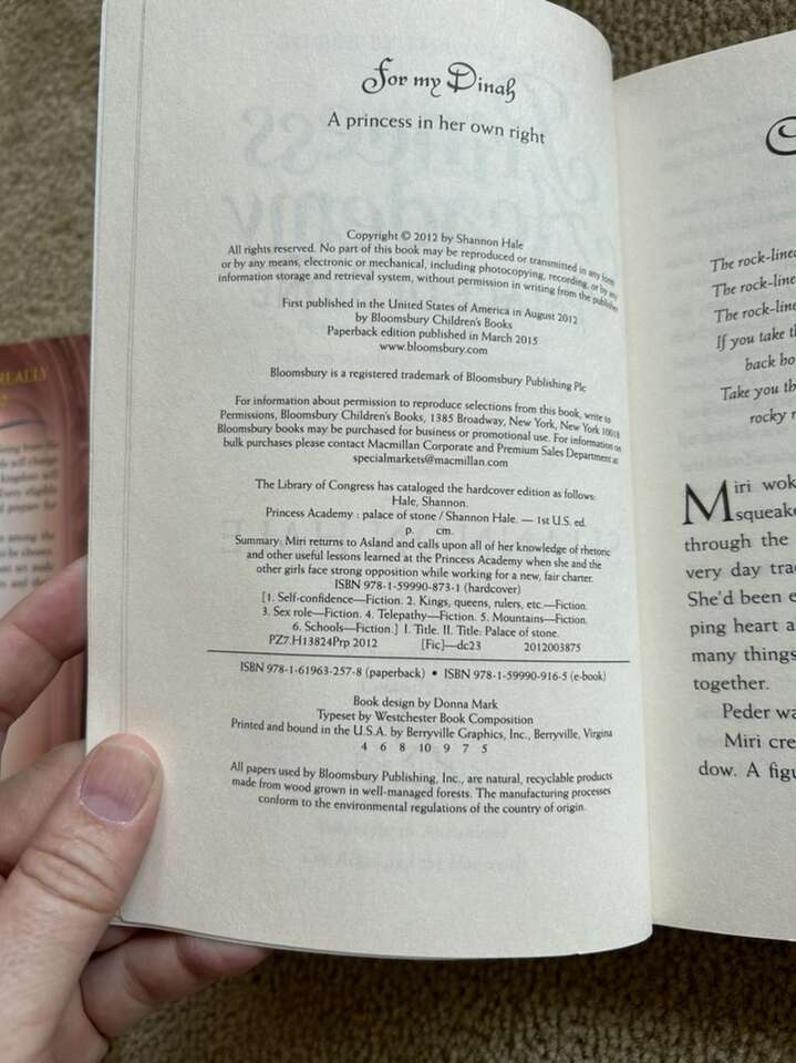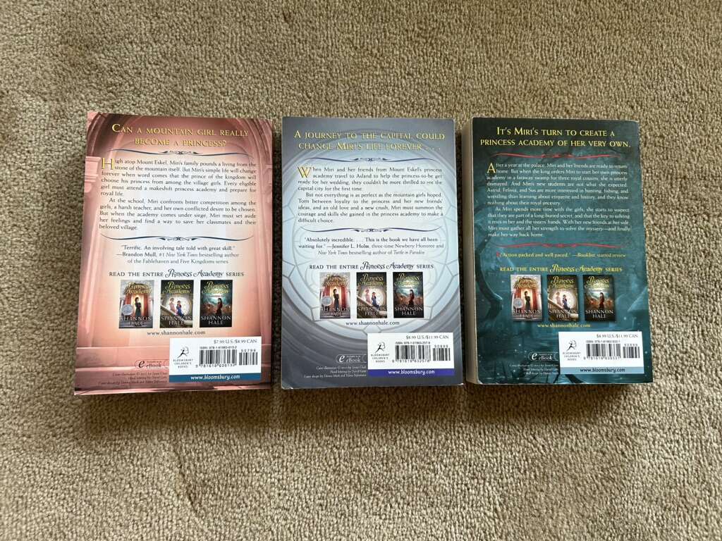 Complete Princess Academy Series, by Shannon Hale: Princess Academy (2005, 314 pages—Newbery Honor Book), Palace of Stone (2012, 321 pages), and The Forgotten Sisters (2015, 324 pages). Paperbacks in excellent condition. Text only. Cash or Venmo.
