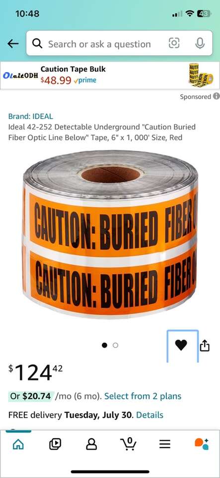I have three rolls of this 6 inch wide by 1000 feet detectable underground “ caution, buried fiber optic line below” tape. They sell on Amazon for $124. Asking $99 each.