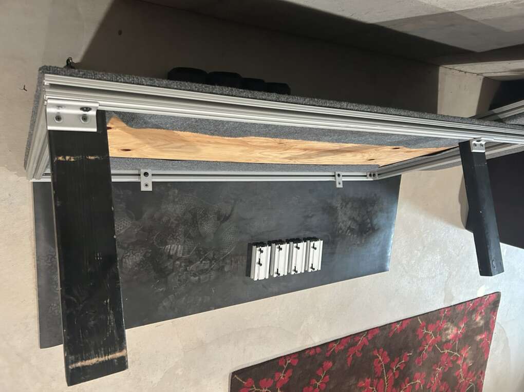 I made this custom camping platform out of 80/20 extruded aluminum so with the T track bolts it gives you a lot of versatility. With both sides it makes a perfect square. You can run just one side either lengthwise or sideways parallel to the cab. I like to run one side when I’m on mountain biking trips so I can put my bike in the back with a fork mount and still have room to sleep.