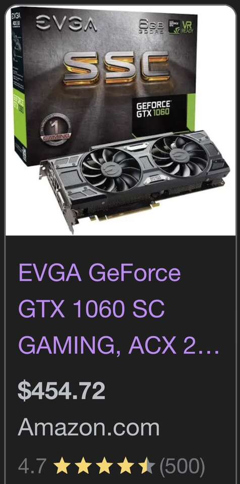 Excellent condition, works great. GeForce GTX 1060, works great for 1080p gaming or VR. Great FPS in Fortnite, Call of Duty, etc. Comparable to 1660 or 6500 XT.