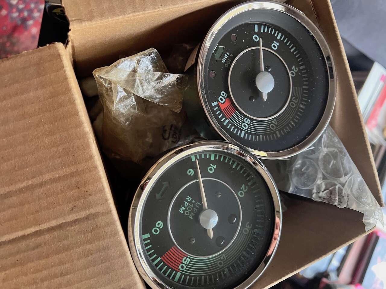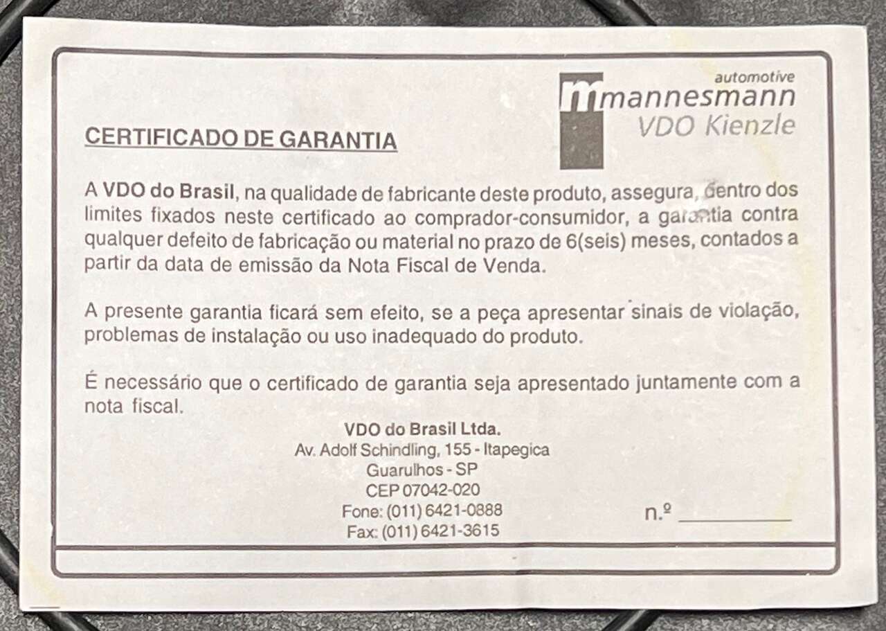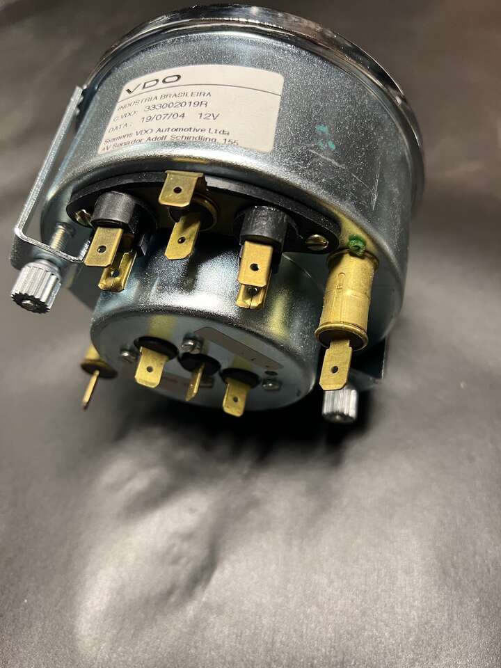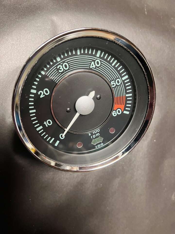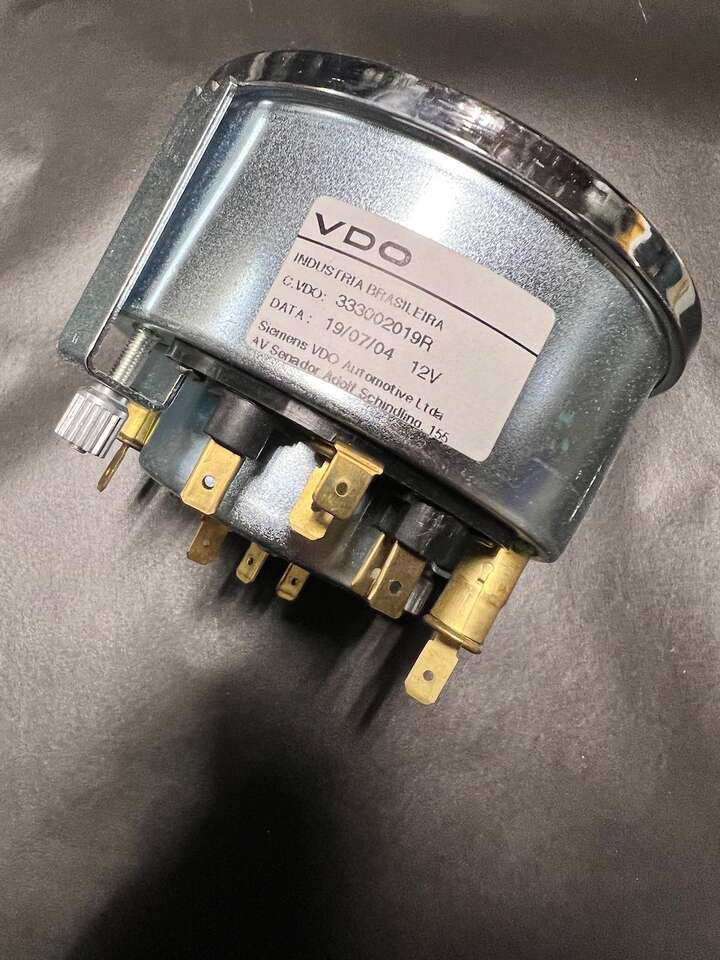 Porsche 356 (type) Electric Tachometer - VDO Brasil - 12V - Unused - Made by VDO - do Brasil Ltda - Adolf Schindling - 2004 - 12V. These are popular (I have been told) among the replica speedster builders as they are $500 to $1000 less expensive than the rare German Electric version. They are a close but not perfect match: I think they are a couple millimeters larger in diameter. There are usually one or two used on Ebay for around $1700 (listed under Porsche 356 Tachometer - and, possibly listed for other German cars). The last photo shows this Brasilian next to a German 356C non-electric (I usually have one or two of the cable-drive, German VDO Tach's available for purchase). Best Offers are considered. Please: no calls . . . cash only - no trades . . . Thanks!