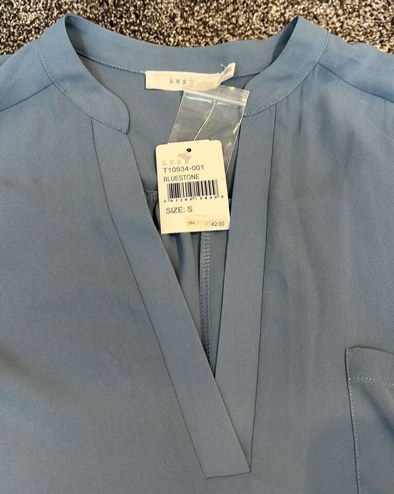 New with tags, LUSH v-neck blue blouse in size small. Purchased from Nordstrom. Smoke-free, pet-free home. $25, cash only please.