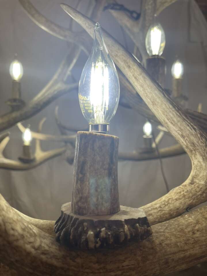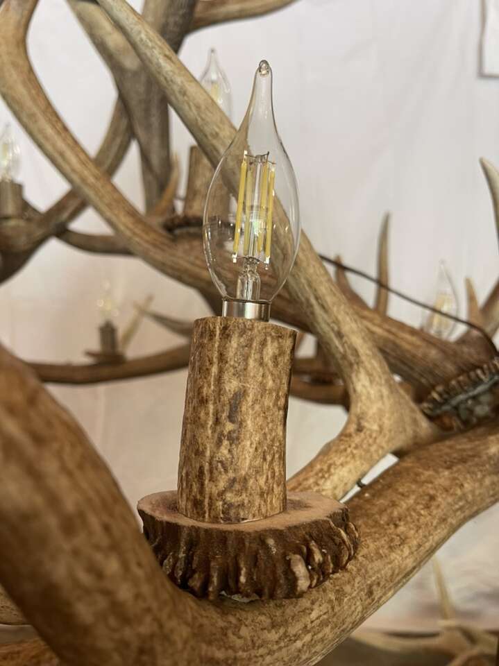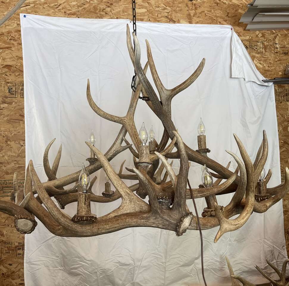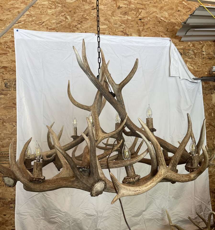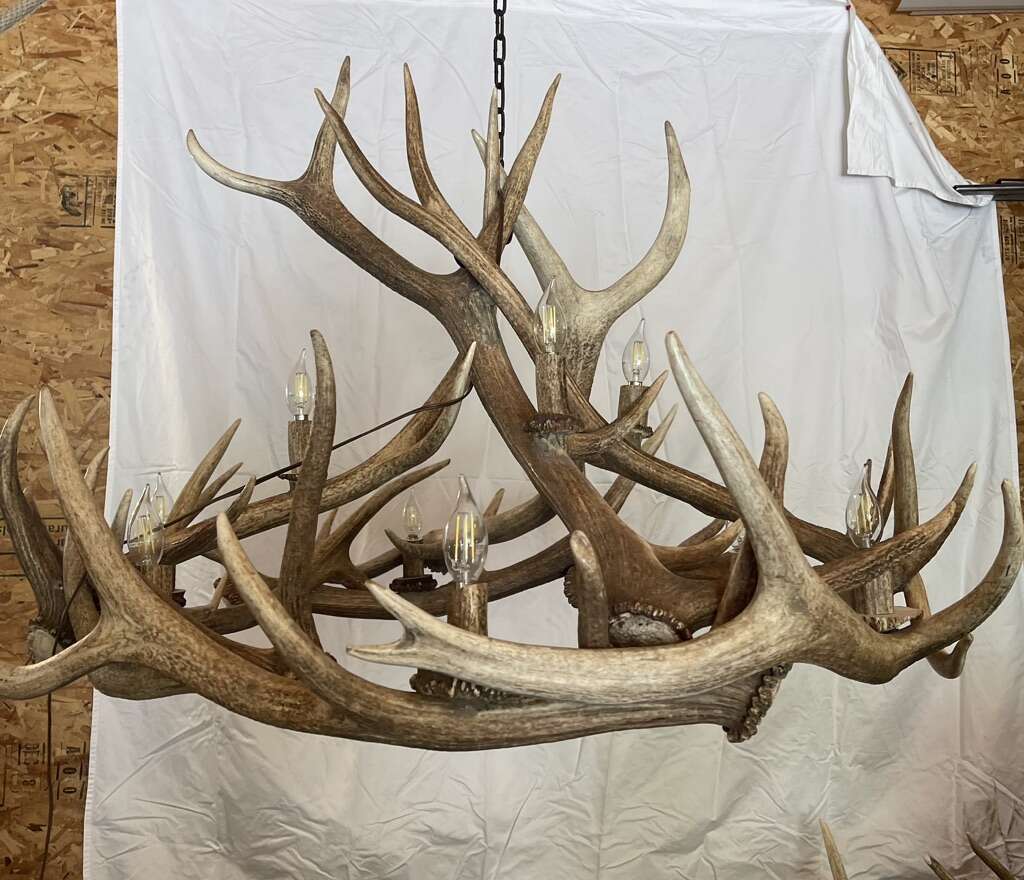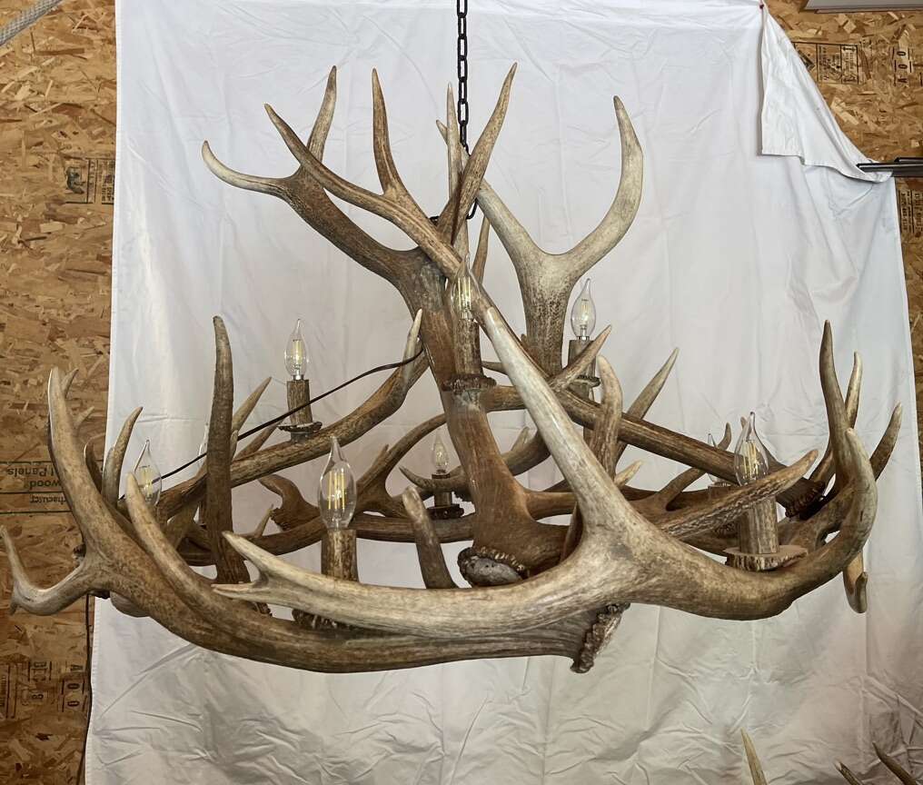 Elk antler chandelier made from 10 real elk antlers. Bring the warmth of the great outdoors into your space. Great for your home, office, business, cabin or any location you desire. Has 10 candelabra 60 watt LED chandelier light bulbs. Measures 29 inches high with a 44 to 52 inch diameter. Averaging a 46 to 48 inch diameter. Approximate weight is 55 pounds. Has heavy chain to hold chandelier weight. Must see to appreciate the wilderness uniqueness of this chandelier. Handmade with lots of love, from shed hunting to the finished elk chandelier.