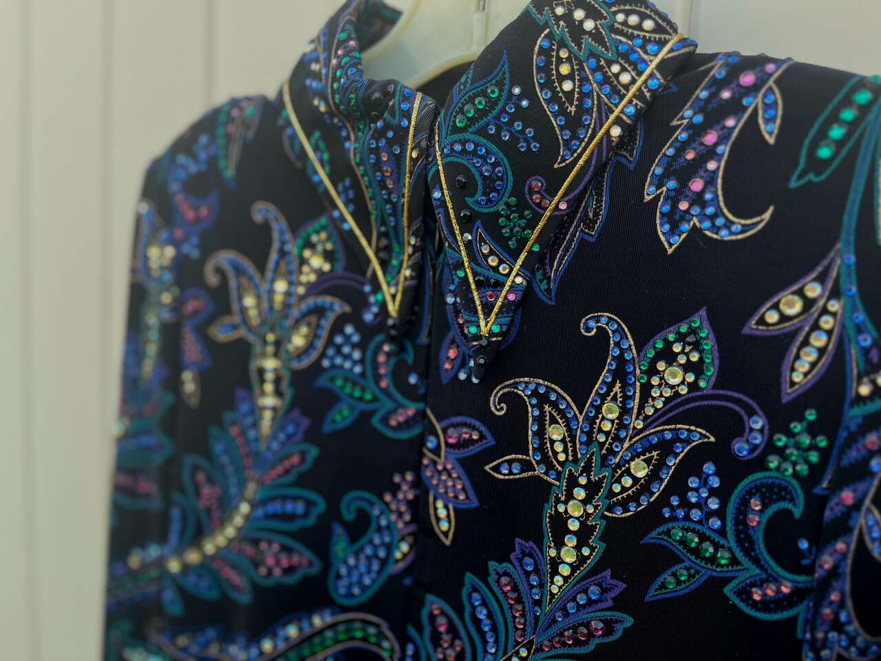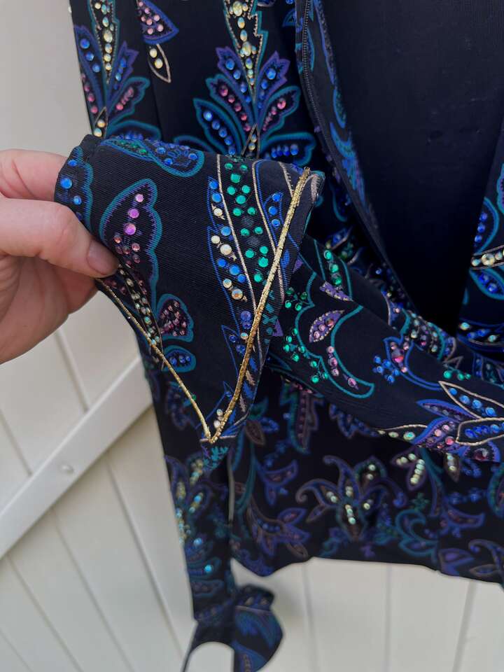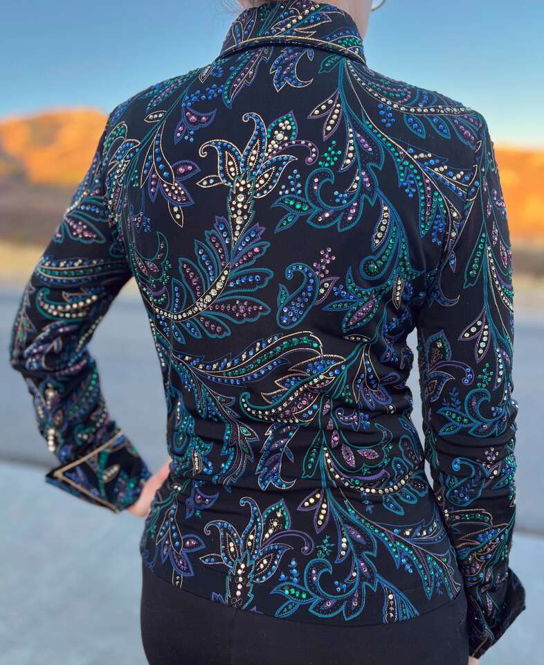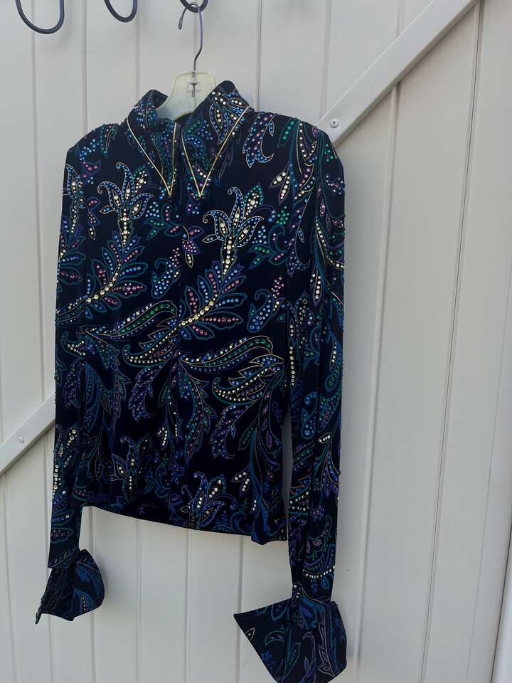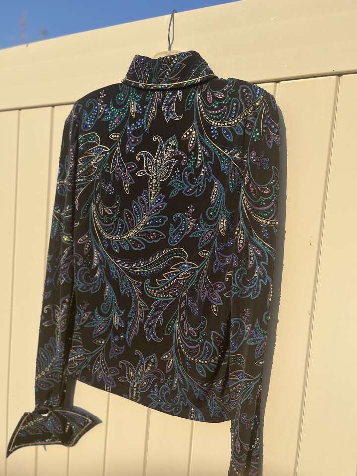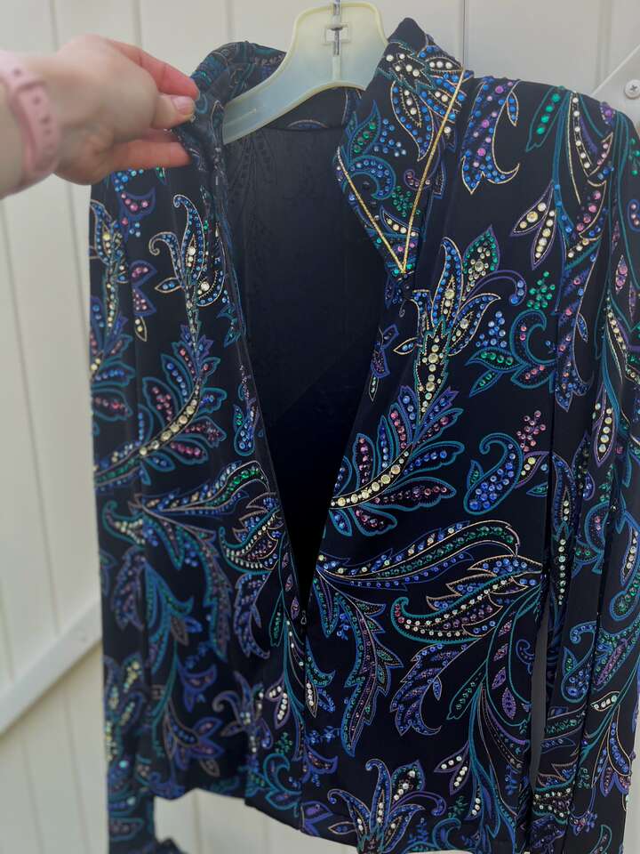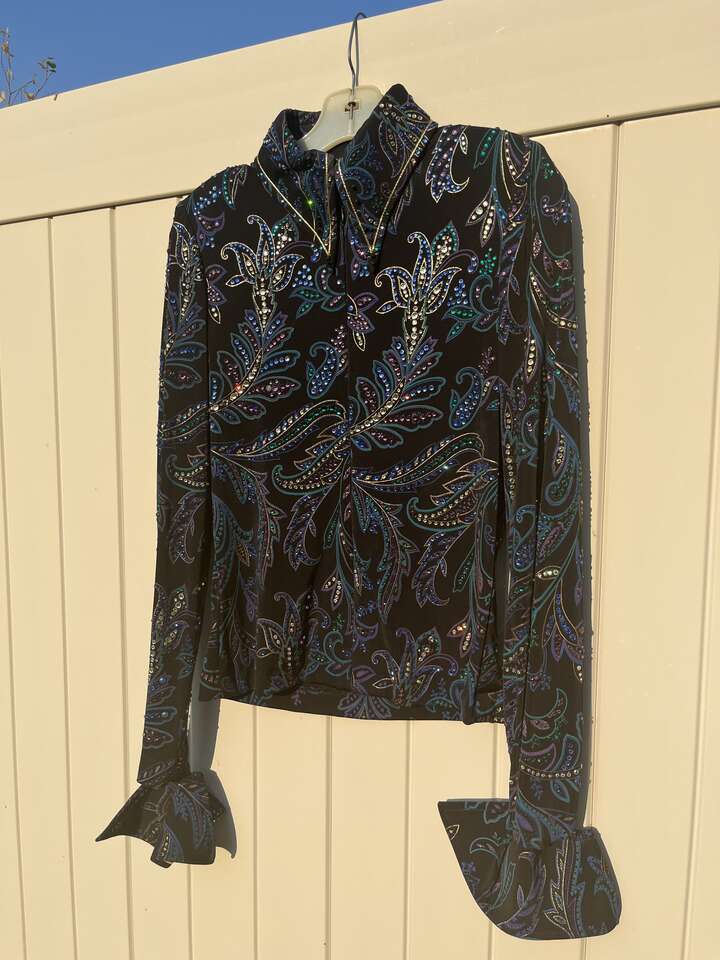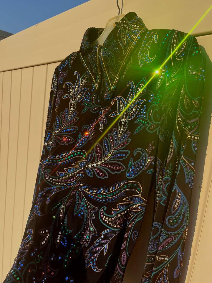 ZelleThis is a high-end black Western show jacket that originally retailed for over $1000. It's covered in crystals that catch a lot of light, though the level of sparkle is difficult to capture in photos. (I have a video of it in the sunlight I can text.) This is approximately a women's size small, though it's beautifully lightweight and stretchy. The cuffs and collar are smartly tailored, and it has subtle, sewn-in shoulder pads. It has a hidden zipper down the front from collar to hem. It's in excellent, show-quality condition at a great savings! Here are the approximate measurements: 17 to 18 inches from pit-to-pit (straight across with jacket lying flat) waist 15.5 inches at smallest point (straight across with jacket lying flat) shoulder seam to cuff 26 inches inside of cuffs 7.5 inches neck interior approx 14 inches I travel I-15 frequently and am happy to meet at freeway exits between Brigham City and Layton. Please follow the other listings by seller link for many more high quality Western show items at great prices.