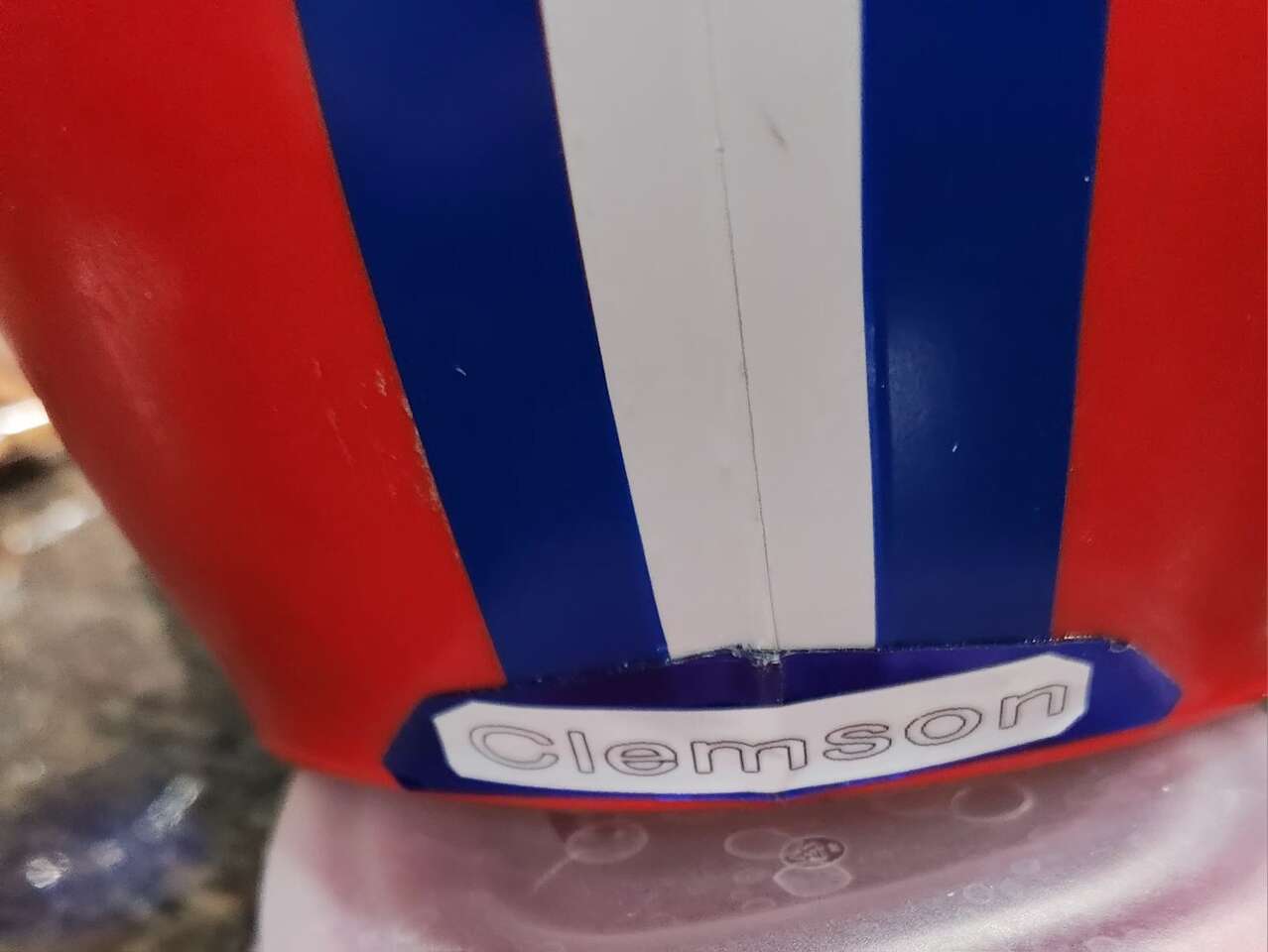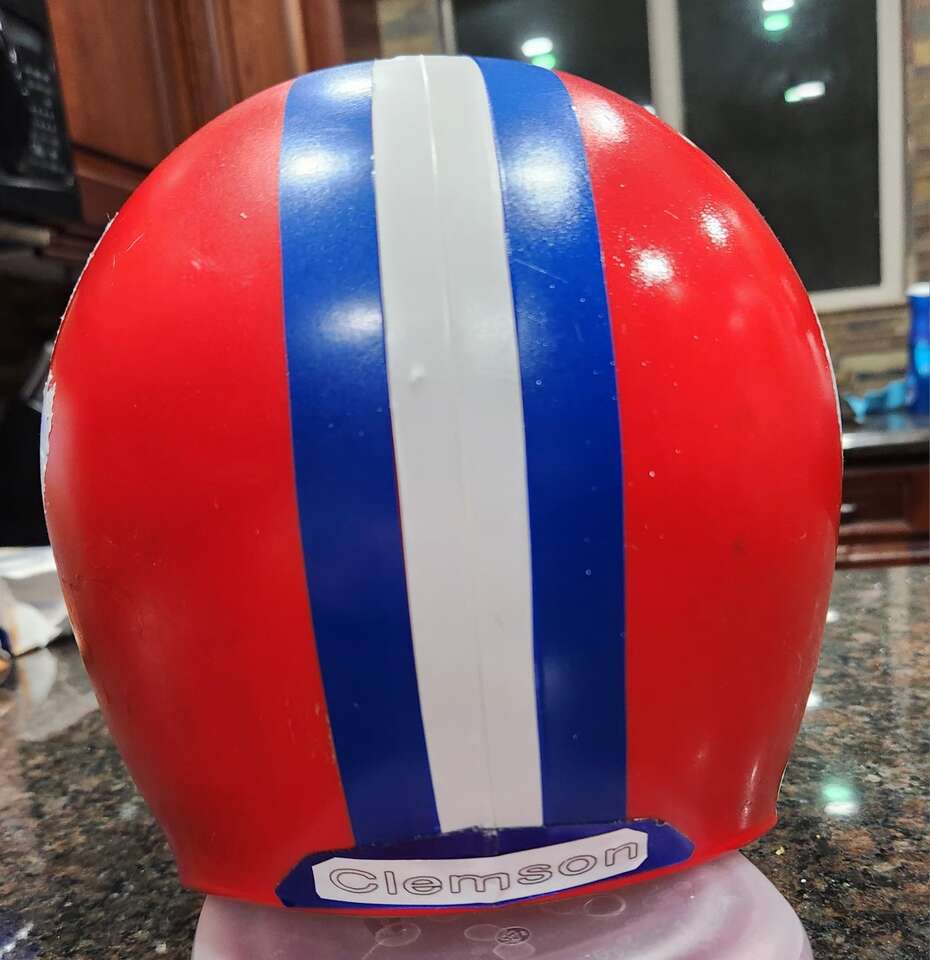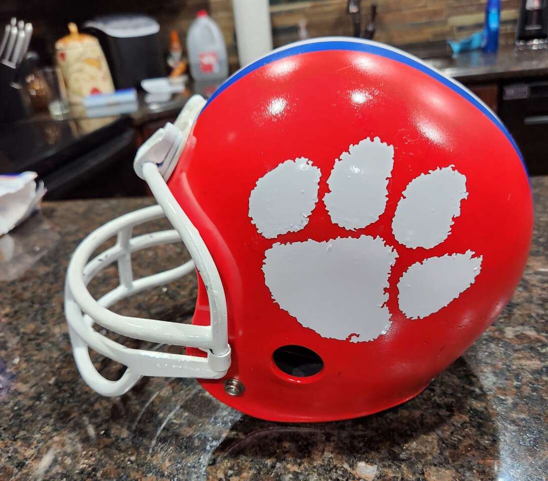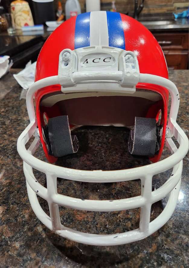 Franklin brand play Football helmet. Helmet is used and does show some wear, but has new decals, but has been refurbished with new decals, stripes, bumpers and interior padding. Not intended for full contact, rather light play, costume or display. Chinstrap available for an additional $5. Accept cash or Venmo.