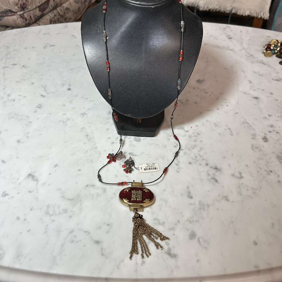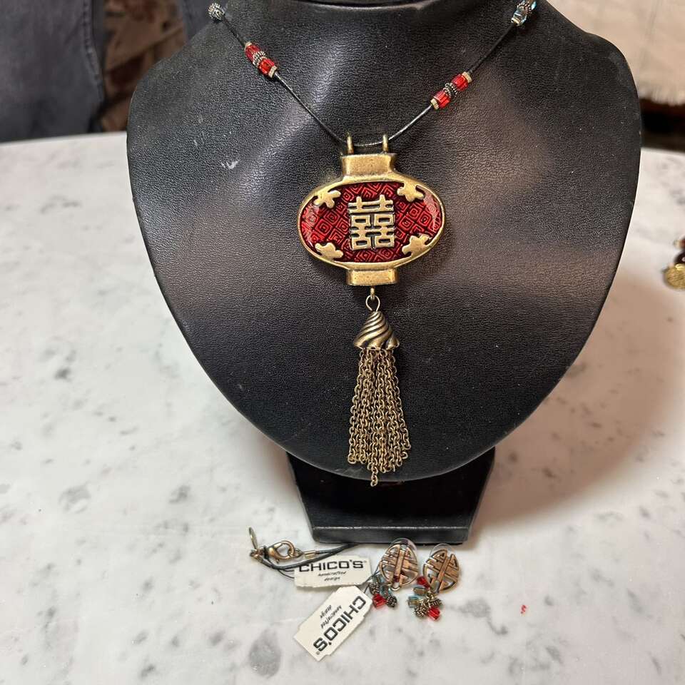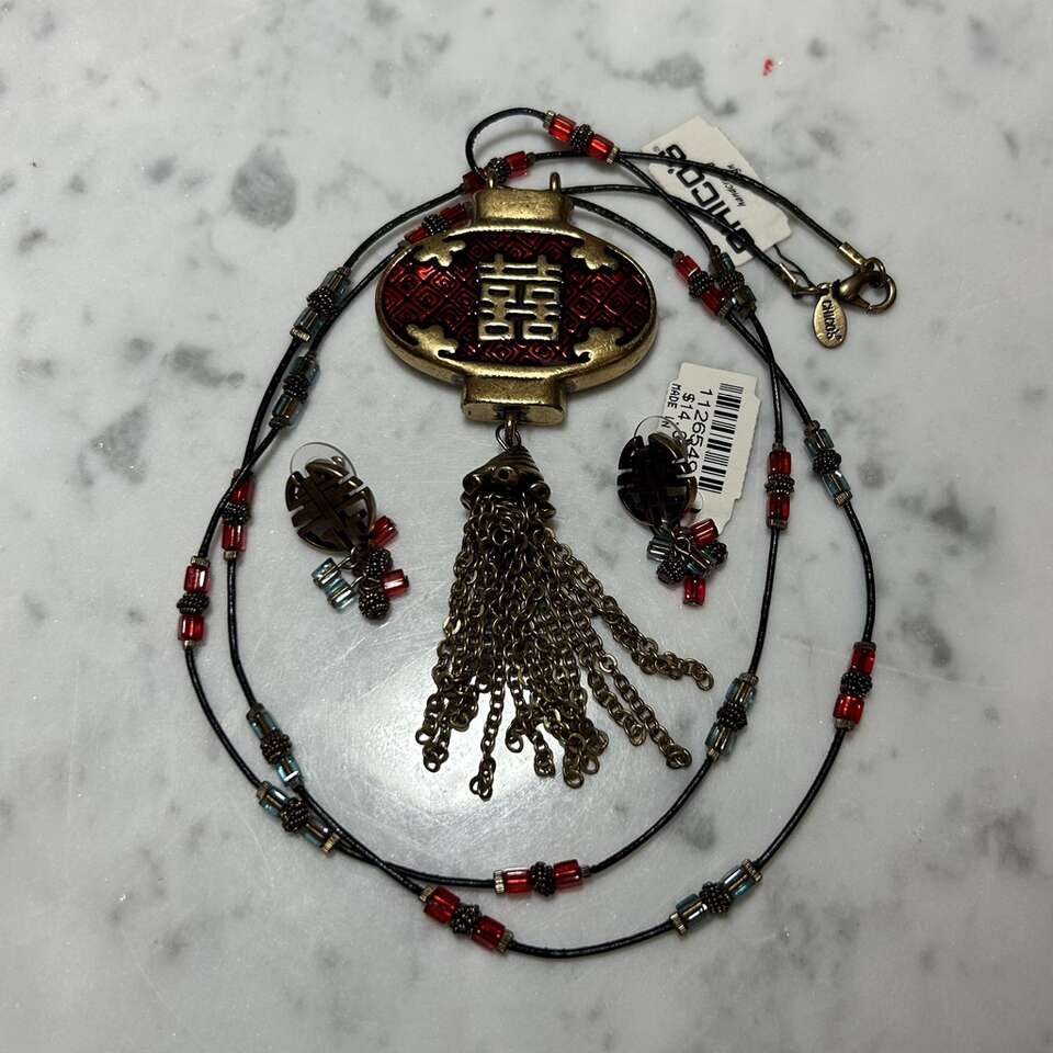 NOS Circa 1980’s Set Enameled Necklace & Matching Earrings with oriental / occidental design: Gold tone pendant resembles a lucky Red Chinese lantern. Characters on red “Lantern” & earrings are symmetrical and appear to be symbolic. Necklace “chain” of beads red and light blue & gold beads and cording is 17” long. Beads appear to be glass. Pierced earrings are just over 1” long. Tags are still Attached indicating this set has never been worn. No scratches or a scratching defects, smoke free. Original price in the 80’s was $58.00. Delivery available to a convenient location when in your area for $5.