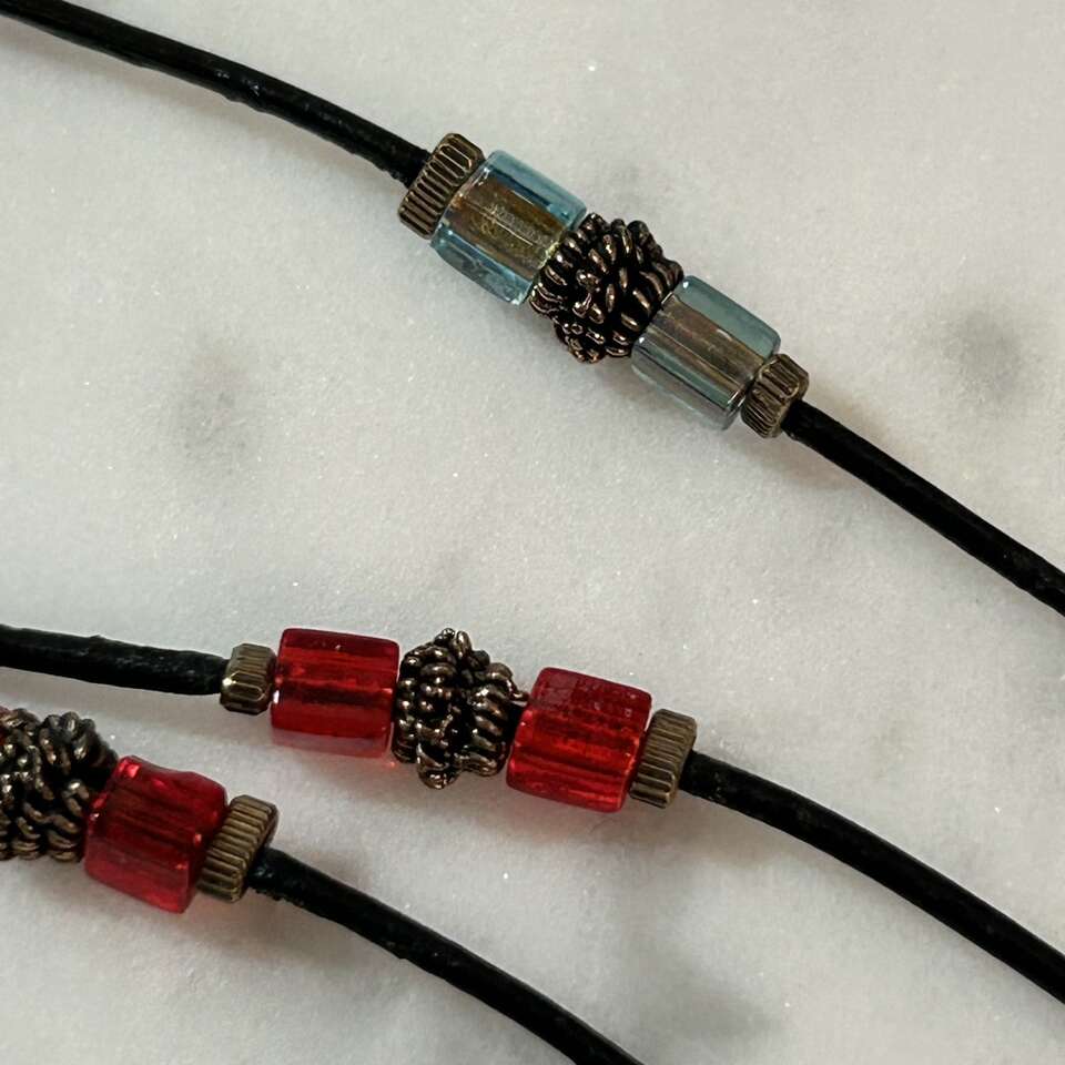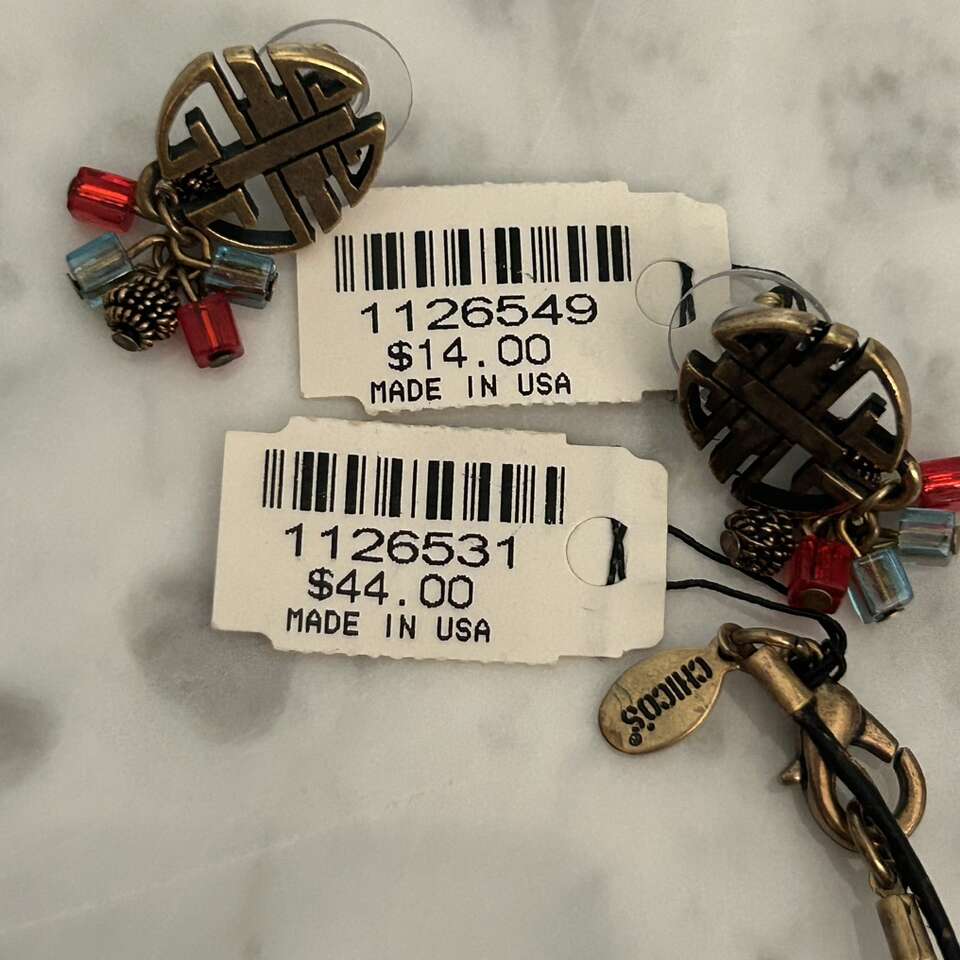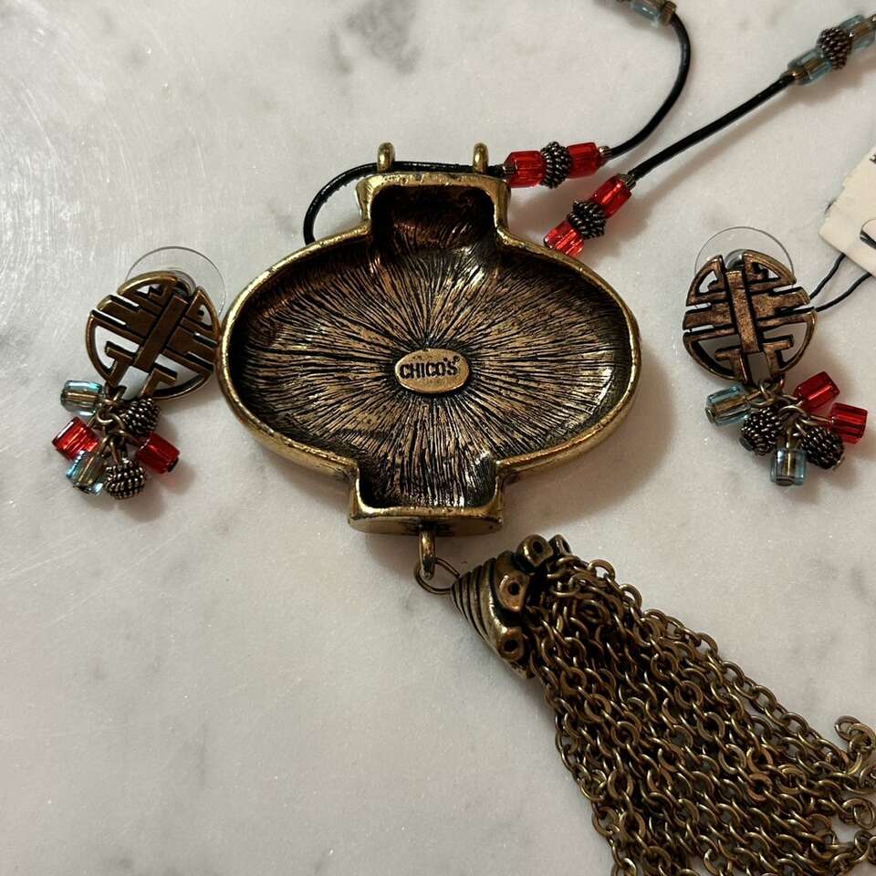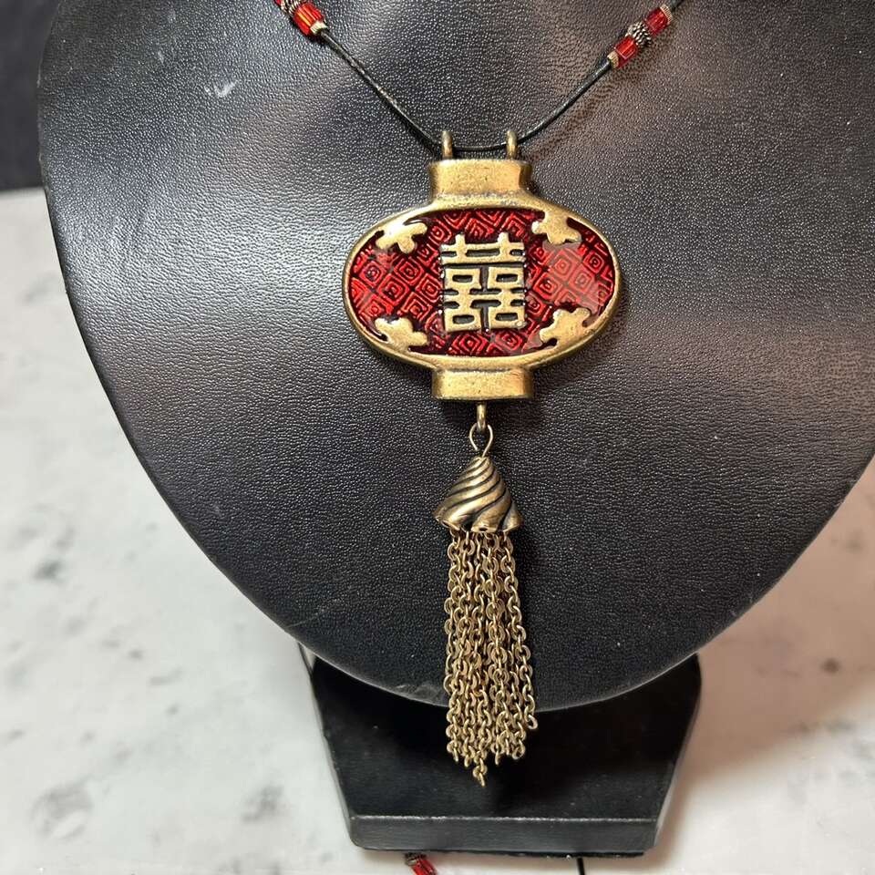 NOS Circa 1980’s Set Enameled Necklace & Matching Earrings with oriental / occidental design: Gold tone pendant resembles a lucky Red Chinese lantern. Characters on red “Lantern” & earrings are symmetrical and appear to be symbolic. Necklace “chain” of beads red and light blue & gold beads and cording is 17” long. Beads appear to be glass. Pierced earrings are just over 1” long. Tags are still Attached indicating this set has never been worn. No scratches or a scratching defects, smoke free. Original price in the 80’s was $58.00. Delivery available to a convenient location when in your area for $5.