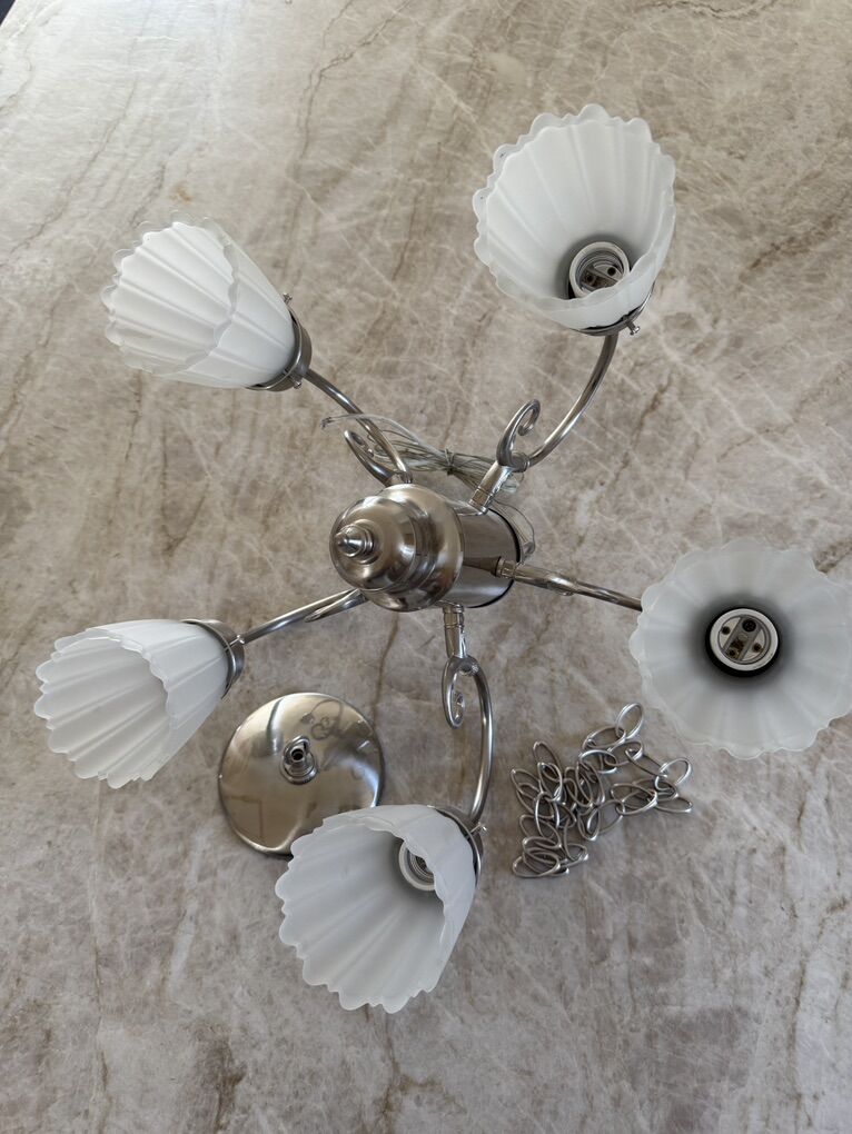 VenmoAlmost new chandelier. Brushed chrome finish. Everything to hang fixture included. About 3 feet of chain. Fixture is about 13 inches tall. Please text with questions. Cash or Venmo accepted.