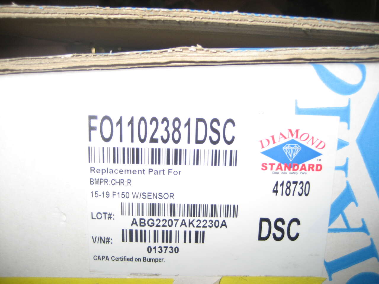 One New aftermarket 2015-2020 Ford F150 Chrome left rear bumper end w/sensor hole.