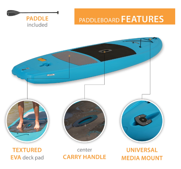 Lifetime Amped 11 ft Stand-up Paddleboard Perfect for intermediate paddlers Durable high-density polyethylene (HDPE) construction UV-protected; will not fade, crack, or peel Retractable fin for surf or flat water paddling Front deck bungee for accessible storage Eva deck covering for increased traction Center carry handle for easy transport to the waterfront Paddleboard leash attachment loop