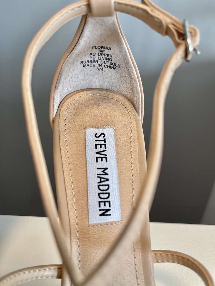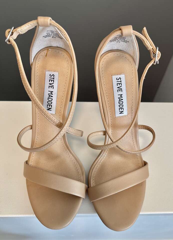 Beautiful Steve Madden Floriaa Natural man-made leather strappy heels. Criss cross ankle straps. Almond toe w/ 1/4" platform sole. 4" heel.