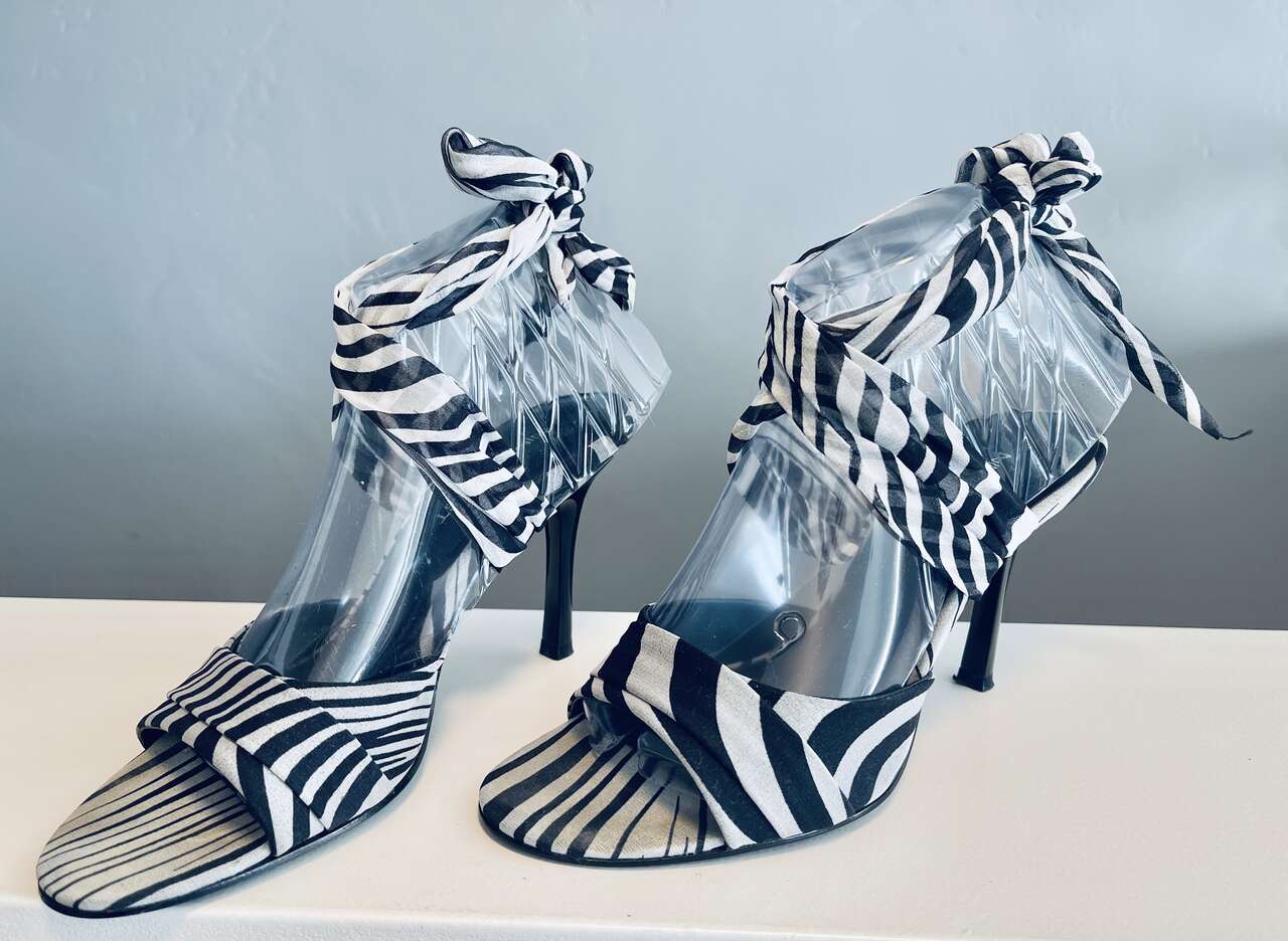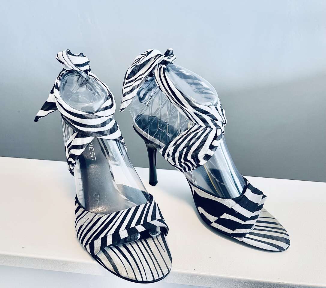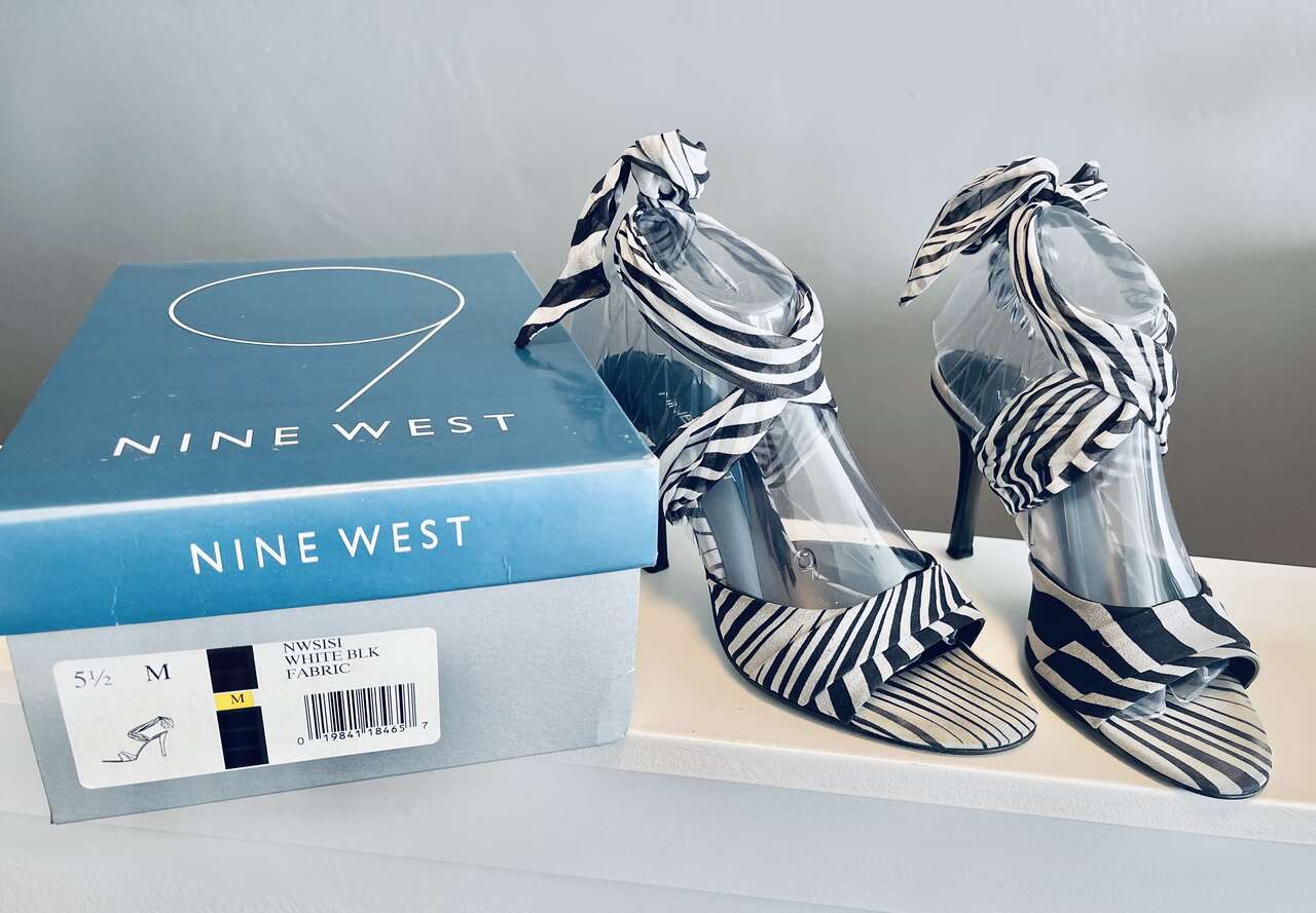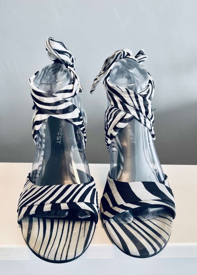 Beautiful Nine West Sisi chiffon ankle wrap open-toe heels. Black/white variegated zebra pattern w/ solid black heels. Almond toe, comfortable 3.5" heel. Overall great/good gently pre-worn condition. Slight discoloration from wear on inner sole under the ball of foot that cannot be seen when worn.