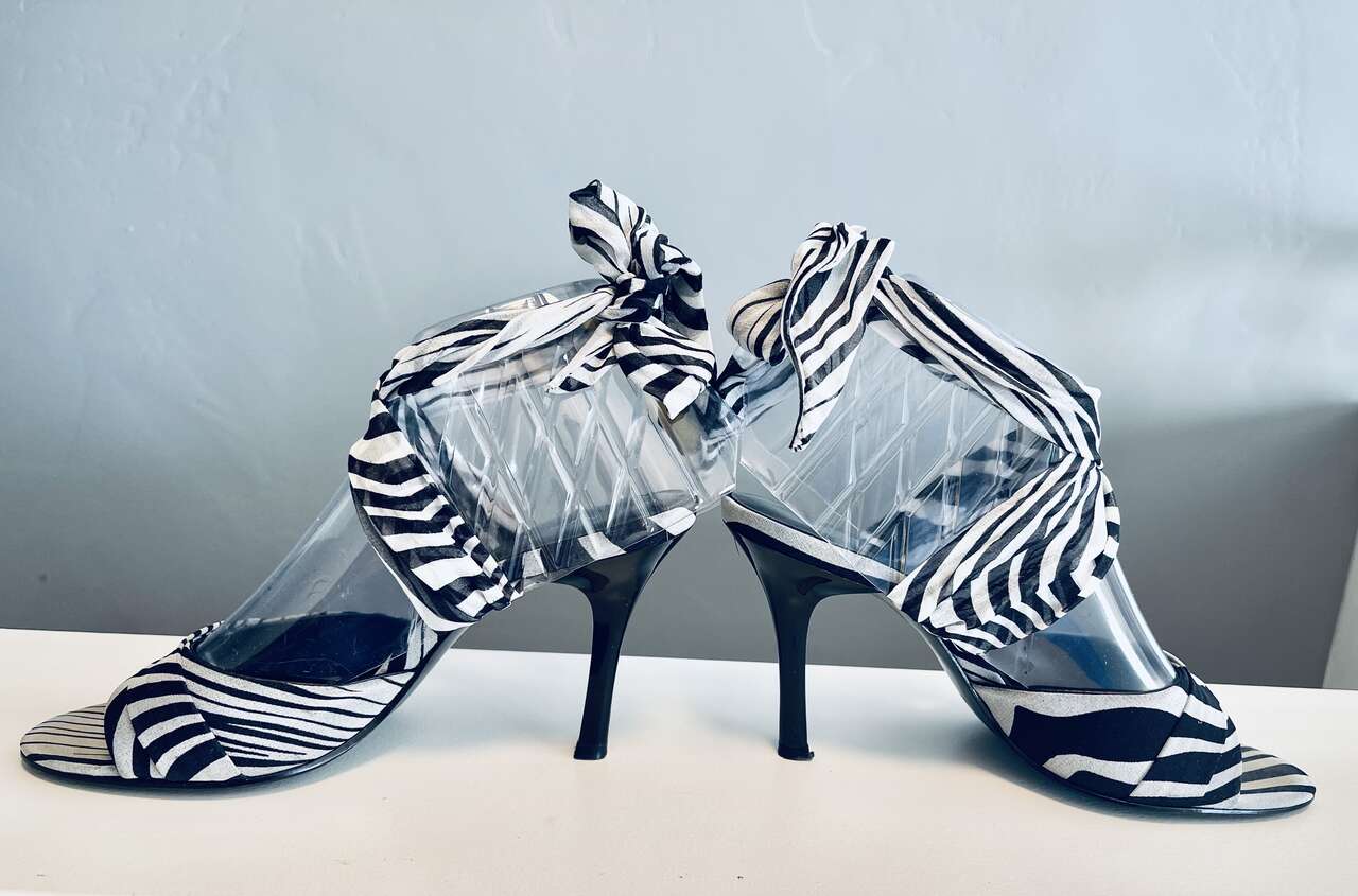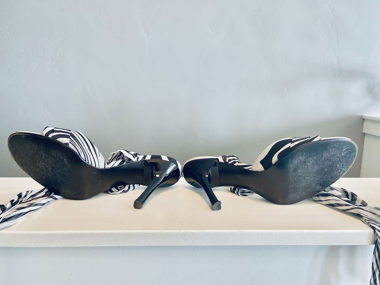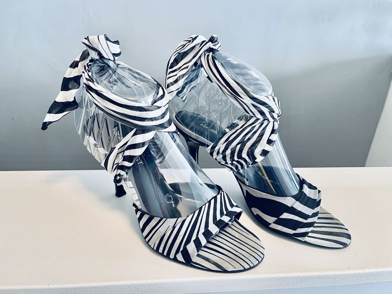 Beautiful Nine West Sisi chiffon ankle wrap open-toe heels. Black/white variegated zebra pattern w/ solid black heels. Almond toe, comfortable 3.5" heel. Overall great/good gently pre-worn condition. Slight discoloration from wear on inner sole under the ball of foot that cannot be seen when worn.