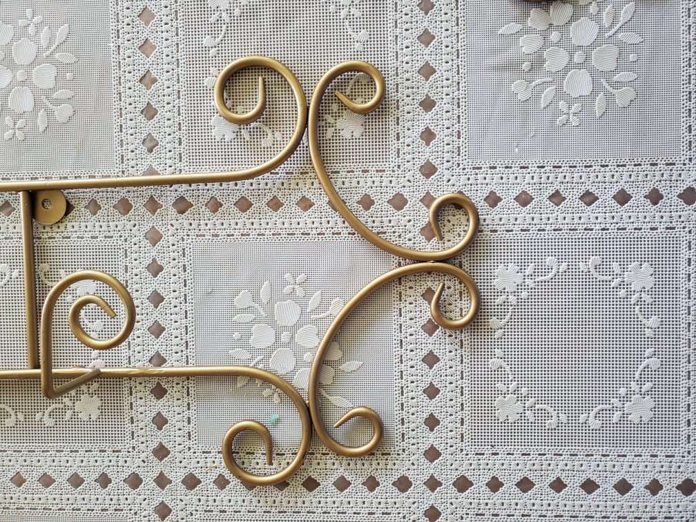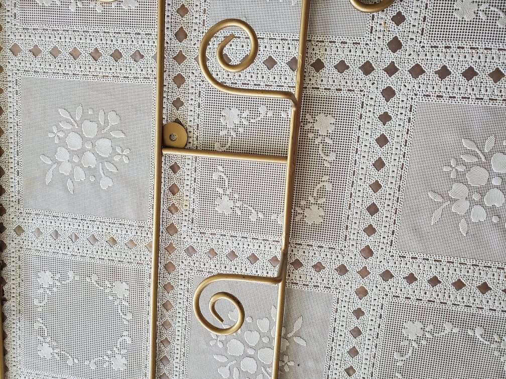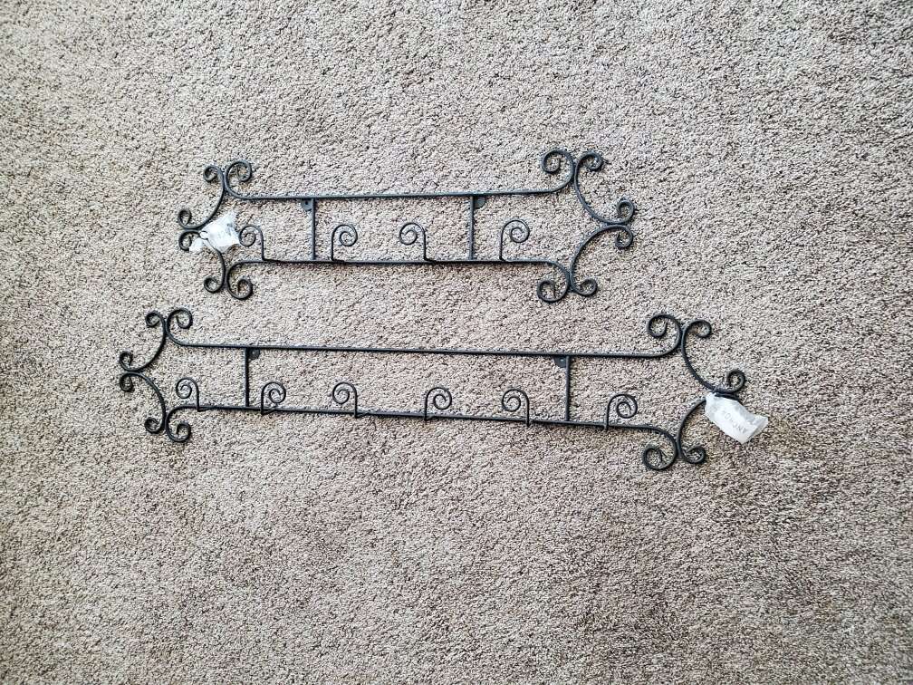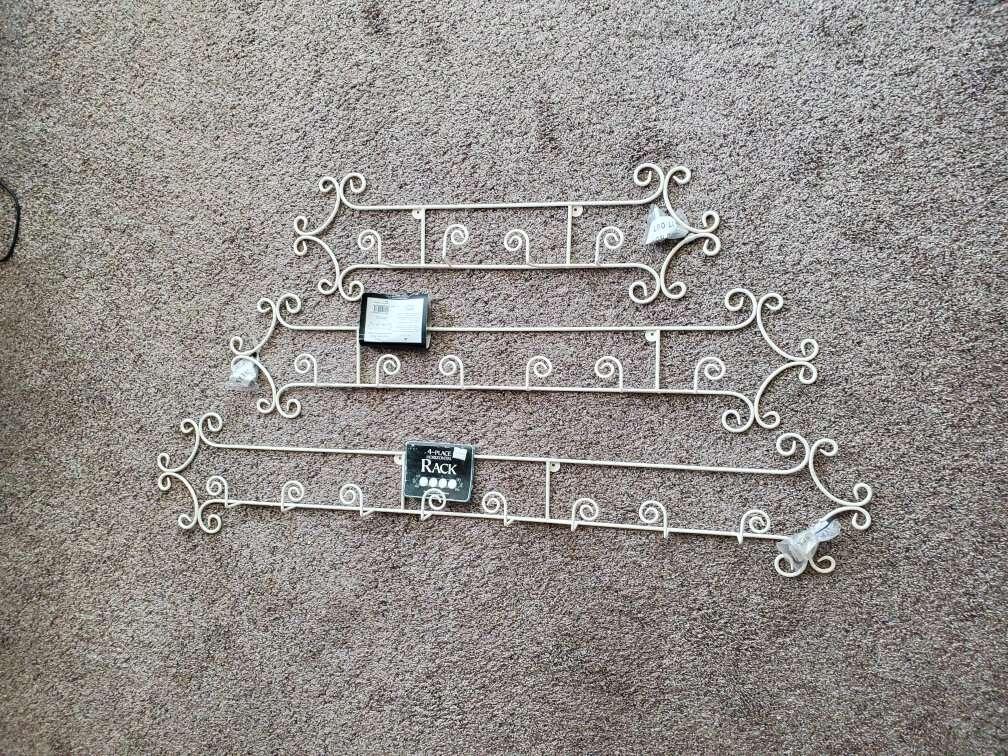 Beautiful Gold Decorative Plate Racks. They hang horizontally. These are new and have never been hung. They have the mounting screws. They hold items from 6.5" to 8.25". The 4 place measures about 45.5" $ 15 each The 3 place is about 36.5" long. $15 each The 2 place is about 27". $10 each. I have 3 of each size. I also have ivory colored in all 3 sizes and black colored 3 place and 2 place racks. CASH ONLY