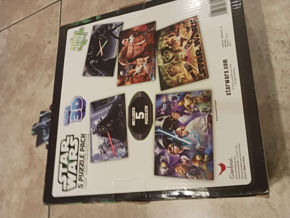 5 Star Wars linticular (3D) jigsaw puzzles. New in box. One bag has been opened but puzzle was not assembled. Hours of fun for Star Wars fans. Linticular pictures move when viewed at different angles.