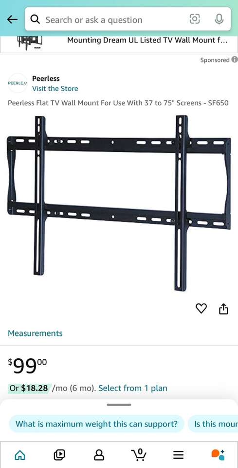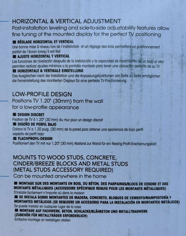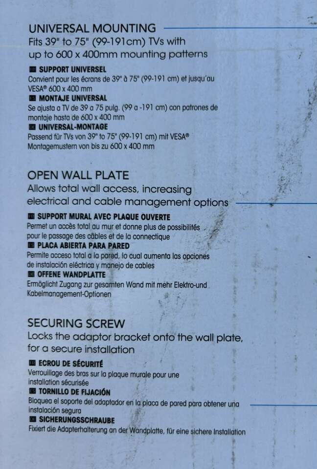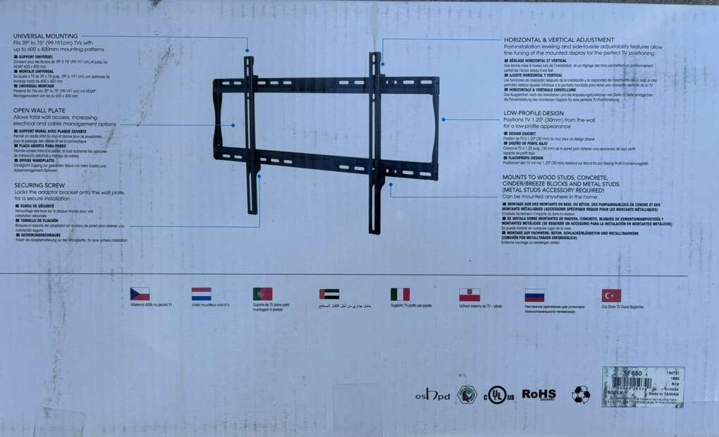 Description- Flat TV wall mount for TVs with 37-75” screens. See photos for more product information and specifications.