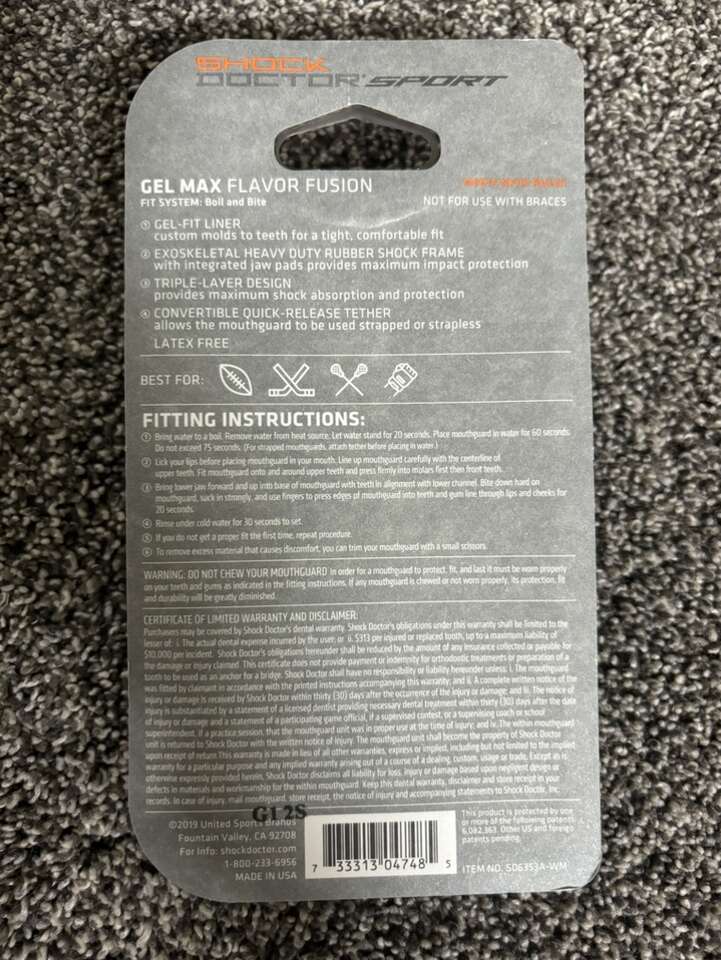 NEW in package Shock Doctor Sport Gel Max mouth guard. Adult 11+, can be used for football, lacrosse, basketball, etc. $10, cash only.
